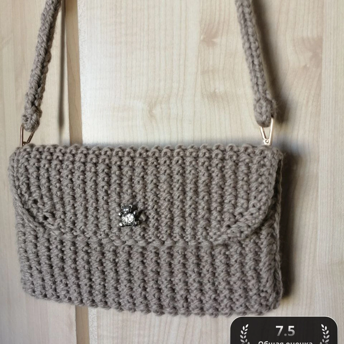 Для этой сумочки использована техника вязания крючком, с простыми столбиками без накида, что придаёт изделию плотность и долговечность. Такой способ вязания обеспечивает изделию красивую текстуру и эластичность, что делает сумочку удобной для повседневного использования. Нитью задействована толстая акриловая пряжа, что способствует созданию достаточно устойчивой формы. Советы по созданию формы заключаются в равномерном натяжении и последовательности убавлений и прибавлений, чтобы сумка была ровной и аккуратной. Обработка краёв сумки аккуратно завершена с помощью декоративного элемента в виде пуговицы-мишки, который крепится спереди для функциональности и красоты. Концы и переходы нитей тщательно прячутся, что позволяет сохранить изделие в первозданном виде.