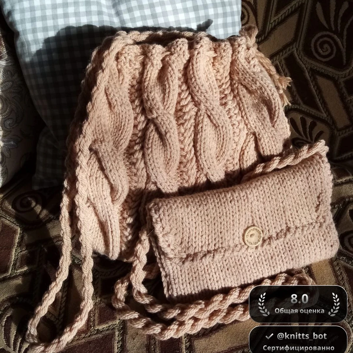 На фотографии изображены великолепно связанные вручную клатч и сумка в одном комплекте. Оба изделия выполнены из пряжи нежного персикового цвета и дополнены красивым узором кос. Элемент застежки на клатче добавляет стильности и элегантности. Такой набор станет не только практичным, но и модным аксессуаром.