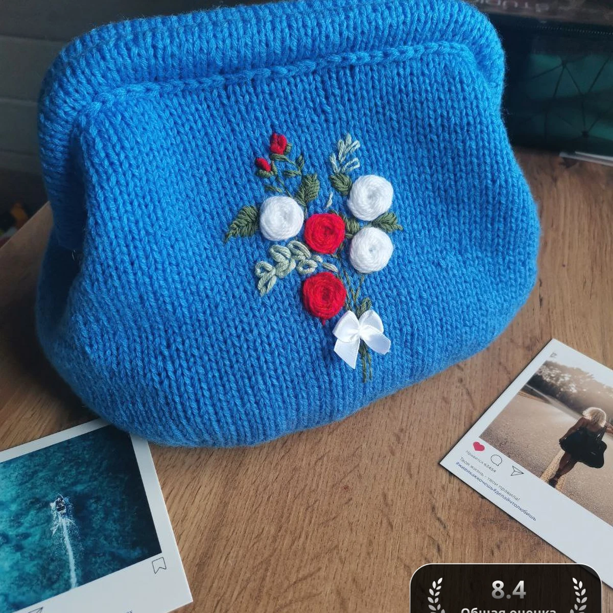 Эта прекрасная сумочка, выполненная в технике вязания, обладает удивительным шармом и дарит ощущение уюта. Ярко-синий фон гармонично сочетается с вышитым цветочным мотивом, делая её настоящим произведением искусства. Компактный размер и удобная форма делают её идеальной для повседневного использования или специального случая.