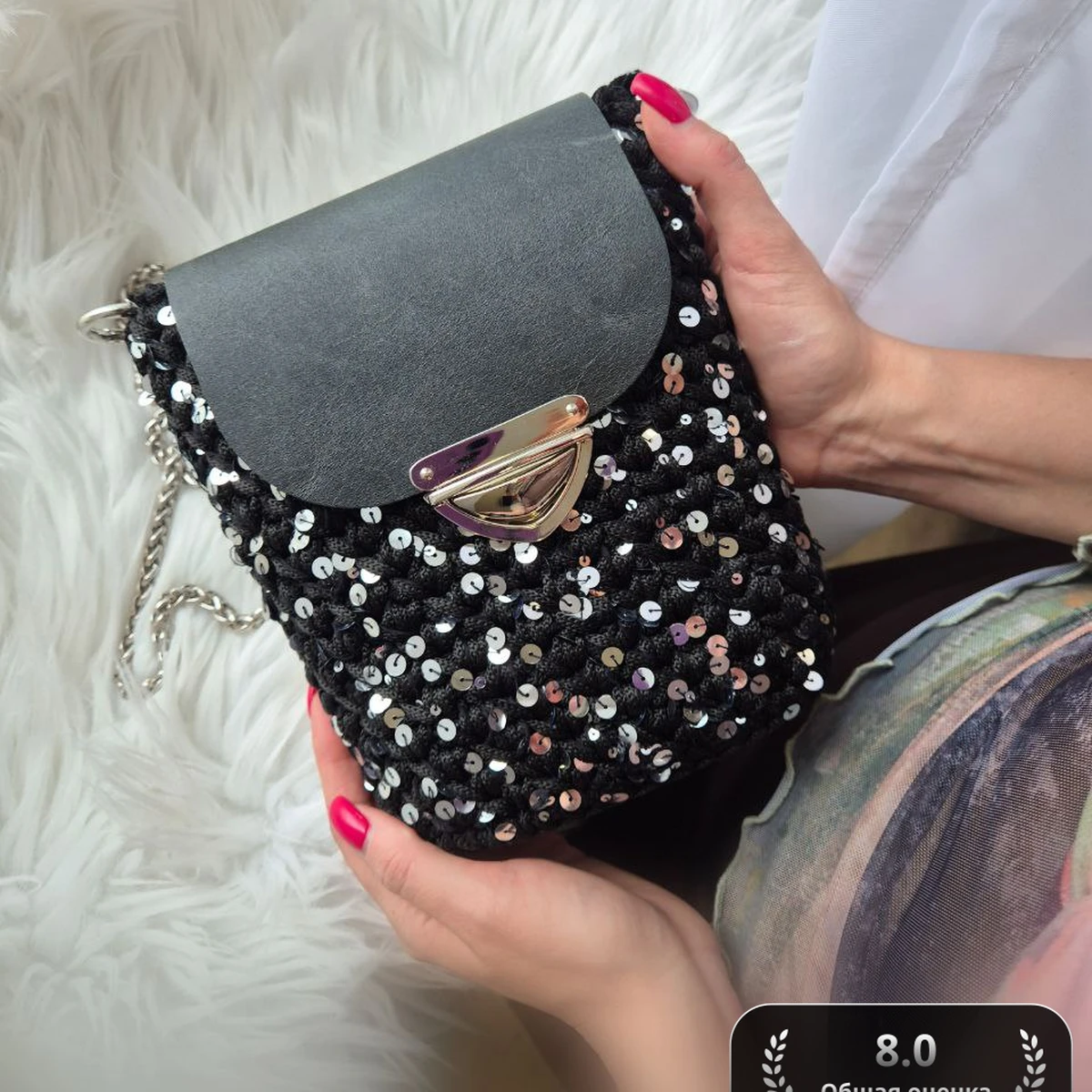 Замечательная вязаная сумочка завершается элегантного вида клапаном, усовершенствовавшим дизайн яркими пайетками. Это идеально подходит для вечернего выхода, добавляя блеска и изысканности. Основной цвет — чёрный, пайетки отражают разные оттенки света, создавая переливающийся эффект. Прочная ручка-цепочка добавляет аксессуару изящества и практичности.