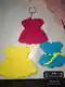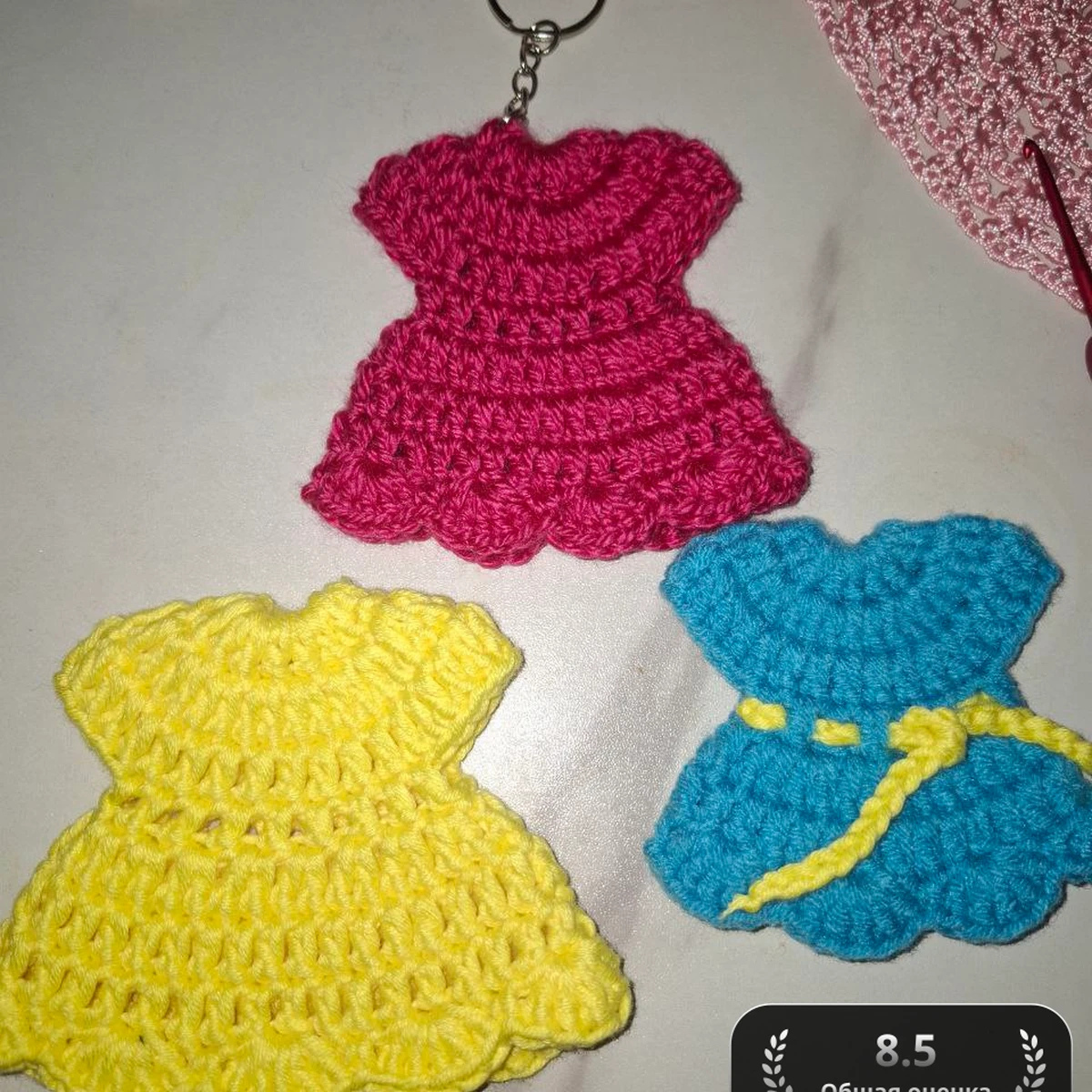 Три мини-платья-аппликации связаны крючком из яркой акриловой пряжи: малиновое с фурнитурой под брелок, лимонно-жёлтое и бирюзовое с жёлтым пояском. Рельефные «ракушки» по нижнему краю создают игривый волнистый подол, а круглые кокетки вырисовываются за счёт прибавок в каждом ряду. Петельки ровные, плотность стабильная, цвета жизнерадостные и отлично сочетаются. Маленький размер делает изделия милыми сувенирами – их можно подвесить к сумке, ключам или использовать как нашивку на детскую одежду.