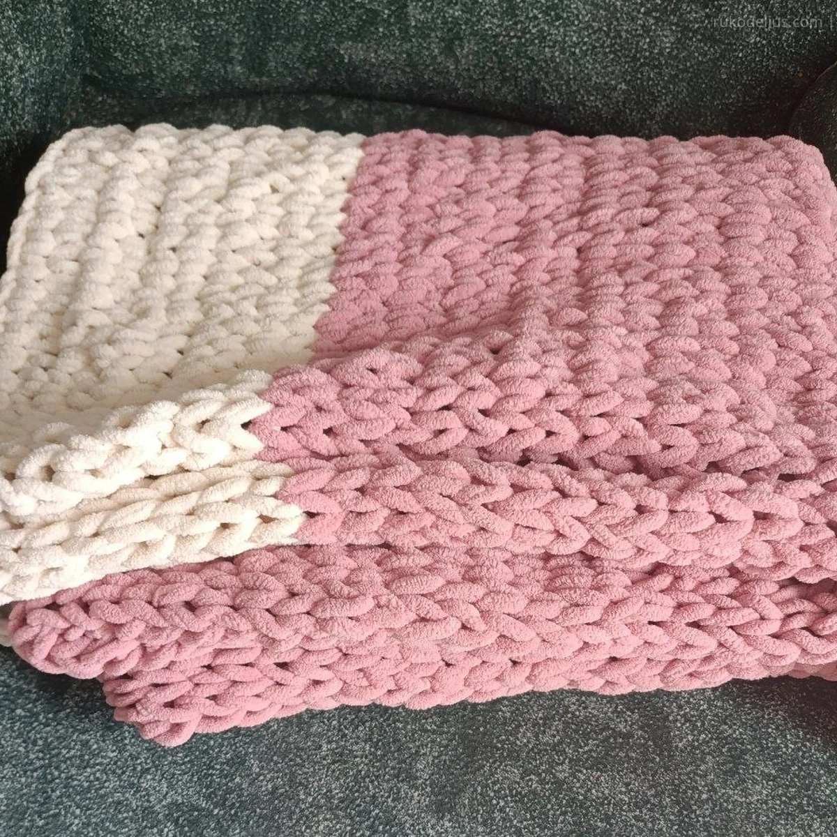 Крупная ручная вязка (возможна вязка на очень толстых спицах/руками) из плюшевой пряжи, полотно прямоугольное, колор-блок из двух цветов.