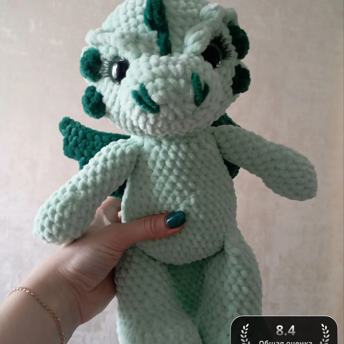 Эта очаровательная вязаная дракоша выполнена из мягкой плюшевой пряжи, что придаёт ему особую нежность и уют. Мягкие мятные и насыщенные зелёные оттенки хорошо сочетаются, создавая яркий и при этом гармоничный образ. Крупные глаза и милые мордочки добавляют игрушке характер и уникальность, а крылышки и иголки делают её ещё более сказочной.