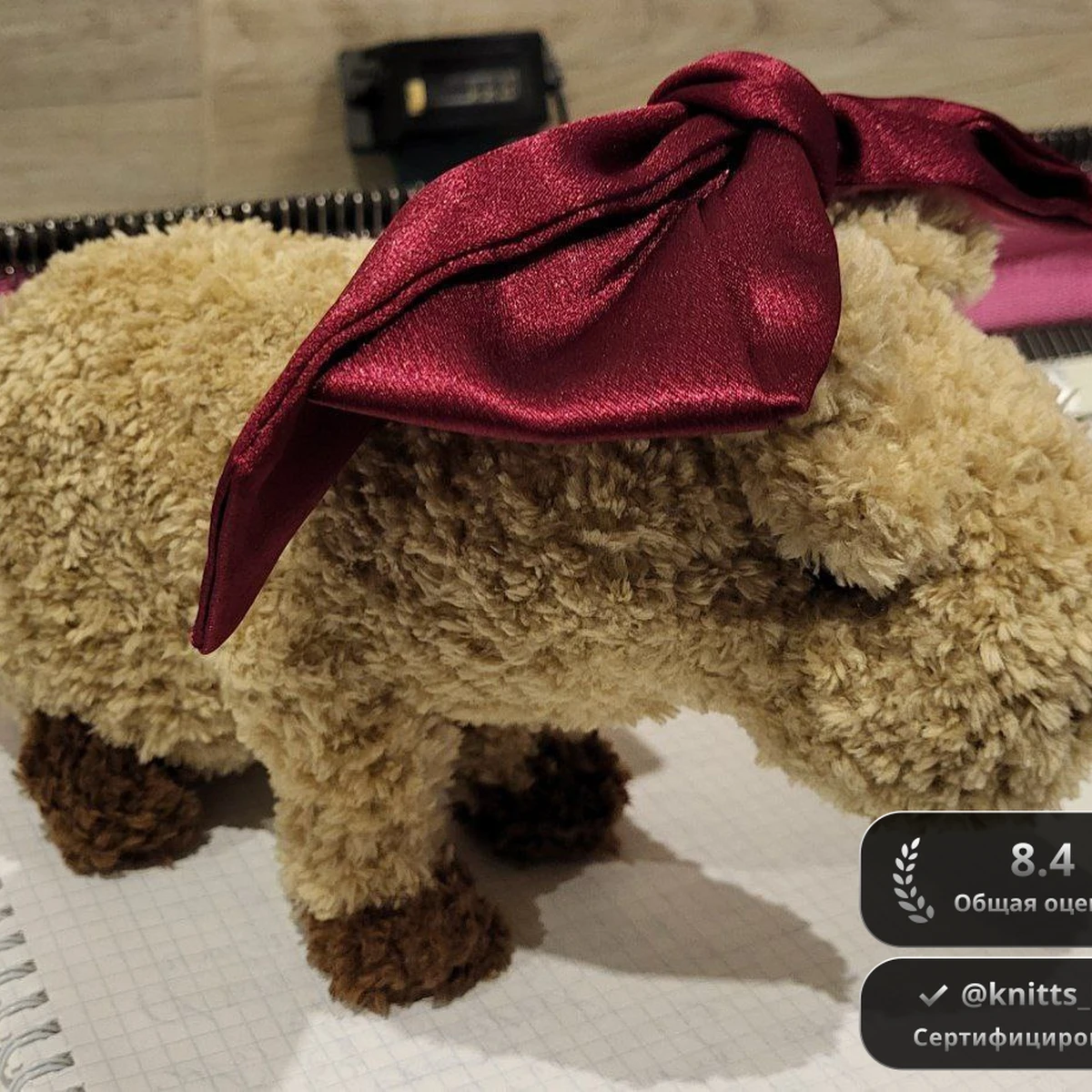 Милейшая плюшевая овечка выполнена из нежнейшей бежевой микроплюшевой пряжи, создающей густую, упругую «шёрстку», которую так и хочется погладить. Тонкие коричневые копытца удачно контрастируют с тёплым телом и подчёркивают реалистичный силуэт. Изюминка образа — широкая винно-бордовая атласная лента, завязанная крупным бантом на макушке: яркий глянцевый акцент делает игрушку по-настоящему нарядной и фотогеничной. Холлофайбер внутри распределён равномерно, благодаря чему овечка устойчиво стоит на четырёх лапках, а аккуратные маленькие глазки придают ей добрый и дружелюбный характер.