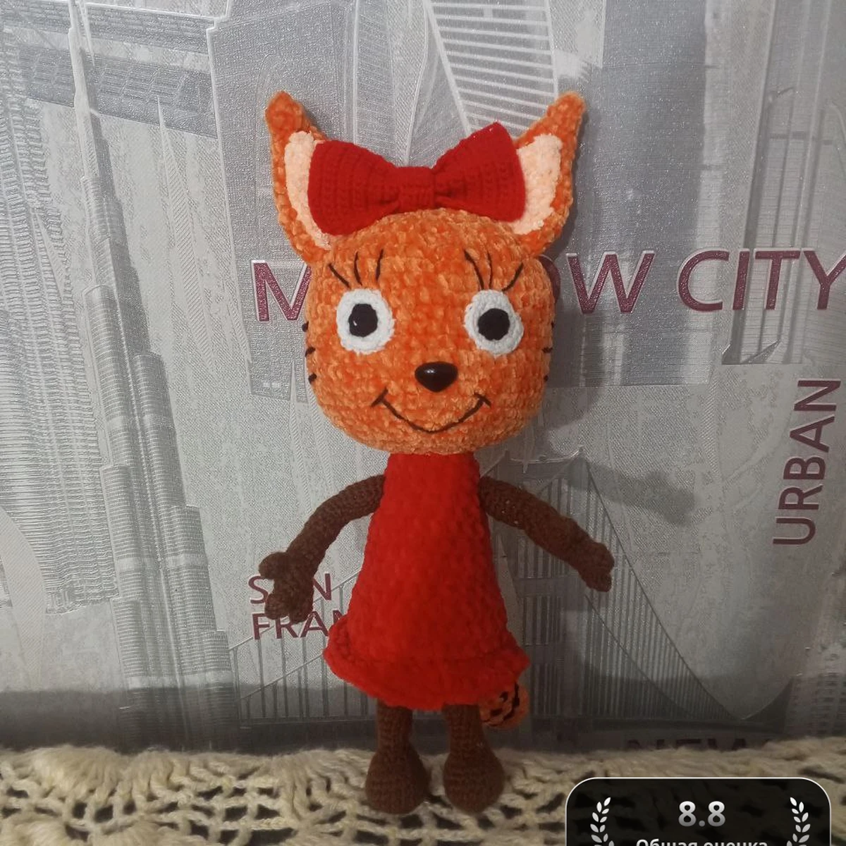 Очаровательная амигуруми-кошечка сразу притягивает взгляд своим ярким апельсиновым мехом и кокетливым красным бантом. Плюшевая велюровая пряжа делает мордочку и платьице особенно мягкими и приятными на ощупь. Большие вышитые глазки придают персонажу живое, мультяшное выражение, а тонкие коричневые лапки, хвостик с полосками и аккуратные ушки завершат образ. Чёткие прибавки и убавки формируют ровную, безступенчатую фигуру, благодаря чему игрушка выглядит аккуратно и профессионально. Платье вывязано отдельным полотном с рюшей по краю, что добавляет игривости и динамики всему образу.