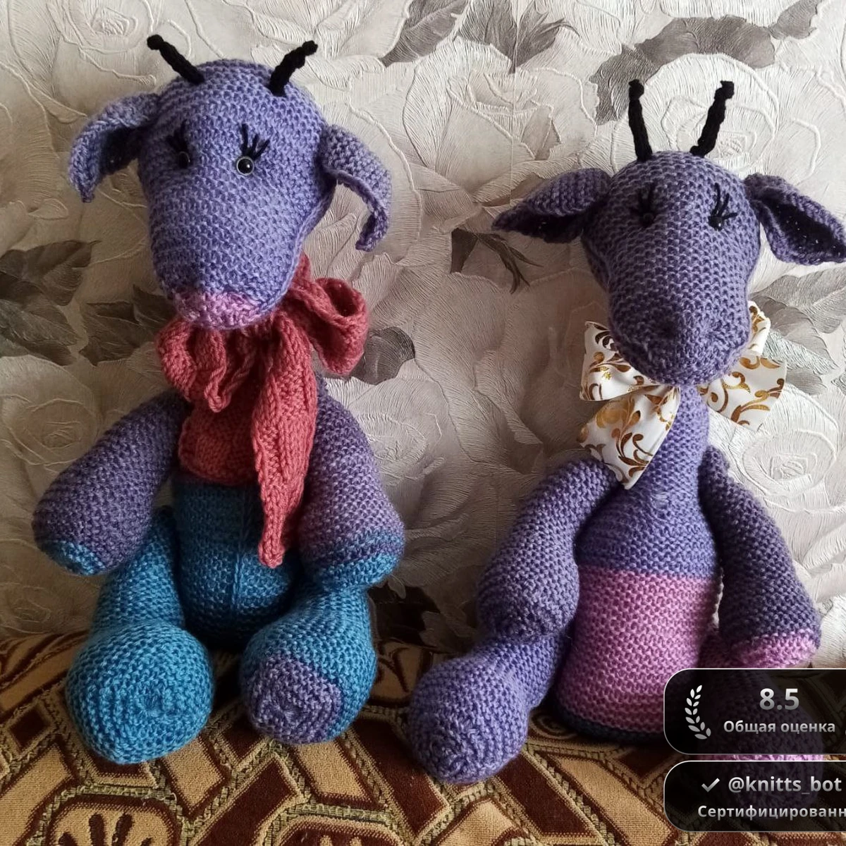 Эти очаровательные вязаные игрушки в форме лавандовых жирафов притягивают взгляд своими яркими деталями и милыми мордашками. Каждая игрушка украшена стильным аксессуаром: один жираф в розовом шарфике, а второй — с элегантной белой лентой с декоративными узорами. Гладкие и аккуратные швы подчеркивают внимание мастера к деталям, а сочетание фиолетовых и розовых тонов добавляет гармонию и уют.