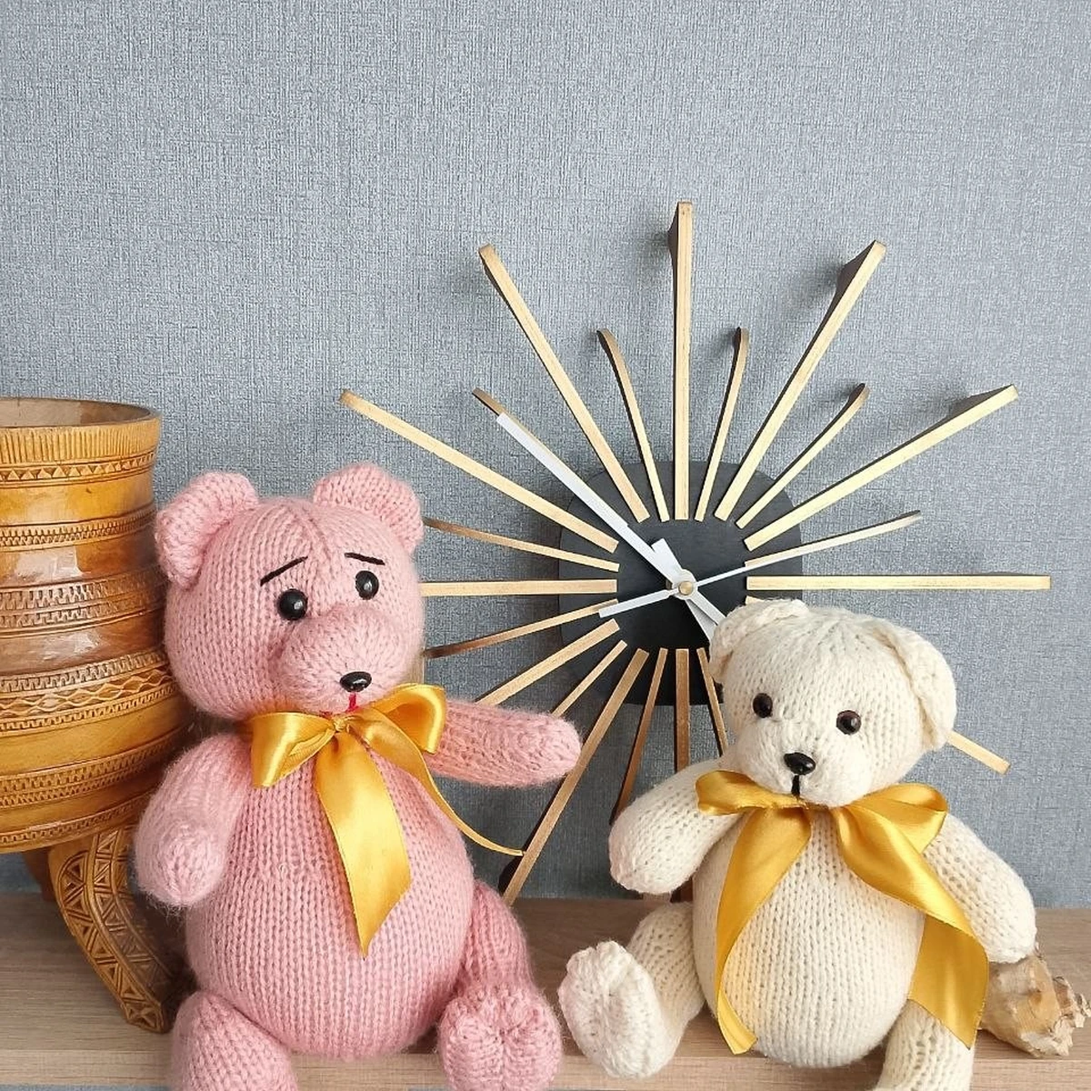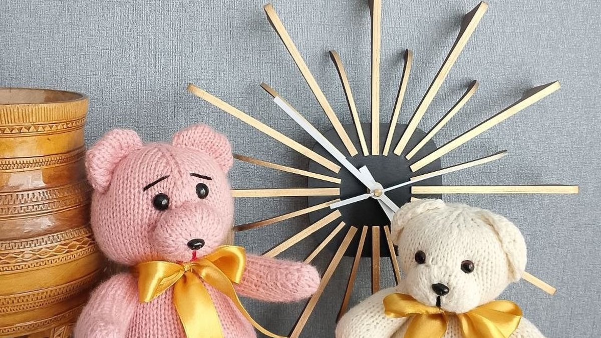 Игрушки выполнены спицами из пряжи средней толщины, основное полотно — лицевая гладь с формированием объёма за счёт прибавок и убавок. Детали (голова, туловище, лапы, ушки) связаны по отдельности, с плавными скруглениями: прибавки распределены по «клинам», убавки стягивают форму без резких углов. Для аккуратности в таких местах лучше использовать симметричные убавки (2 вместе лицевой с наклоном вправо/влево), чтобы линии сходились ровно. Сборка выполнена пришиванием деталей с наполнителем (холлофайбер/синтепух). Чтобы швы выглядели максимально «невидимо», оптимален матрасный шов по кромочным дорожкам и предварительная наметка: фиксируем детали булавками по осям (верх/низ/середина), затем пришиваем мелкими стежками. Мордочка оформлена безопасными глазками и вышивкой носа/рта чёрной нитью; брови вышиты отдельными стежками — тут особенно важна разметка для симметрии. Декор — атласные ленты, завязанные бантом. Такой акцент хорошо поддерживает подарочный стиль; чтобы лента не «ползла», её можно прихватить парой потайных стежков у узла. При желании усложнить работу и поднять класс исполнения — добавить утяжки мордочки, внутренние контрастные вставки на ушках/лапках или фактурные элементы (платочная вязка, резинка, букле-вставки).
