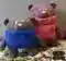 На фото представлены две очаровательные вязаные игрушки в виде медведей. Первый медвежонок одет в яркий синий свитер, а второй в стильный розово-фиолетовый наряд с милой аппликацией. Эти игрушки выглядят очень уютно и вызывают желание обнимать их. Отличный подарок для детей и взрослых, любящих творческие изделия ручной работы.