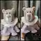 Ручная стирка в прохладной воде (до 30°C) с мягким средством. Не тереть и не выкручивать: аккуратно промять, затем отжать через полотенце. Сушить горизонтально на сухом полотенце, расправив воротник и юбочку; вдали от батарей и прямого солнца. При необходимости — лёгкая отпарка одежды (не касаясь утюгом плюша). Игрушку периодически встряхивать и слегка расчёсывать мягкой щёткой по плюшу. Не стирать в машине, если есть риск деформации и смещения наполнителя.