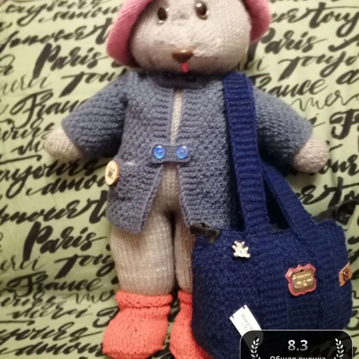 Эта очаровательная вязаная игрушка представляет собой мишку с розовым беретиком и стильной темно-синей сумкой. Она одета в элегантное пальто серо-синего цвета с пуговицами. Игрушка выглядит очень мило и тепло, идеально подходит для детей и взрослых, которые обожают мягкие игрушки. Яркие цвета, такие как розовый и синий, создают игривое и веселое впечатление. Эта работа демонстрирует тщательную работу и внимание к деталям, что делает её особенной и уникальной в своем роде.