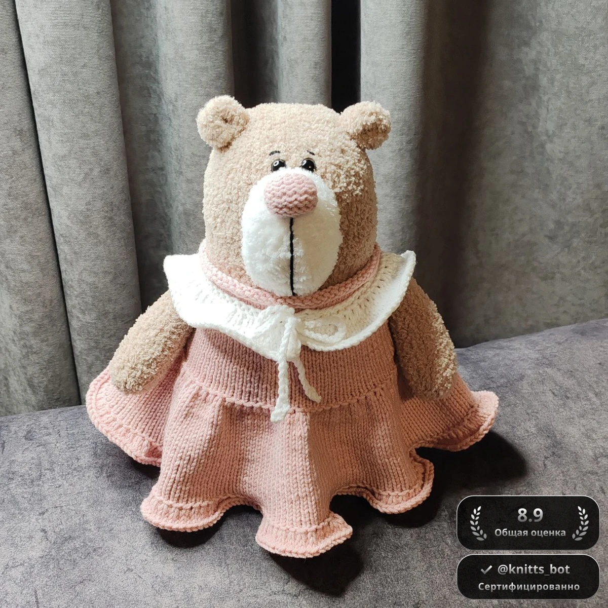 Очень нежный образ: плюшевый мишка в пудрово-розовом платьице с широким расклёшенным подолом и аккуратной отделкой по низу. Белый воротничок-пелеринка с завязками добавляет «кукольности» и делает силуэт нарядным. Мордочка выразительная: ровно поставленные глазки, мягкий контрастный носик и аккуратная вертикальная вышивка. Текстура плюшевой пряжи выглядит уютно, а платье держит форму и красиво расходится складками. Фото чёткое, изделие показано целиком и хорошо читается на нейтральном фоне.