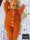 На фото изображен кукольный комбинезон яркого оранжевого цвета. Прекрасный выбор для кукольной одежды, он выполнен с использованием интересного узора, который добавляет текстуру и делает изделие визуально привлекательным. Крупные пуговицы добавляют очарование и контраст. Кукла лежит на покрывале с рисунком, что создает уютную атмосферу на фото.