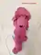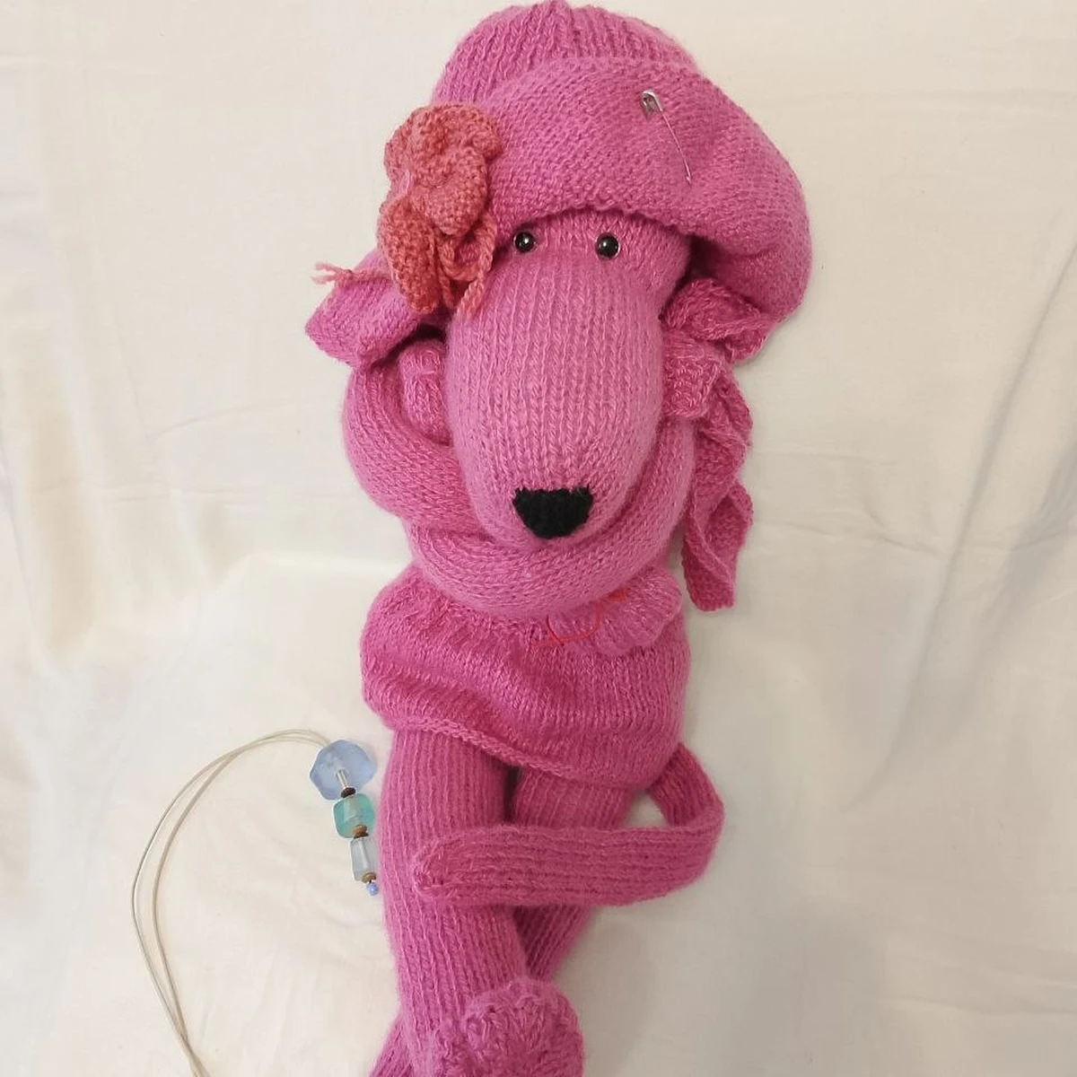 Очаровательная «Розовая пантера» в вязаном исполнении — узнаваемый образ с длинными лапками и вытянутой мордочкой, выполненный в розовой гамме. Интересно обыгран головной убор и декоративные элементы: бусины и аккуратная «носик»-вставка из тёмной пряжи. Фактура в основном лицевая гладь, за счёт чего игрушка выглядит мягкой и «тактильной». Видно, что работа собрана вручную и задумка сильная, но местами не хватает шлифовки: заметны точки крепления деталей и небольшая неоднородность натяжения, а в кадре отвлекают булавка и фон с заломами.