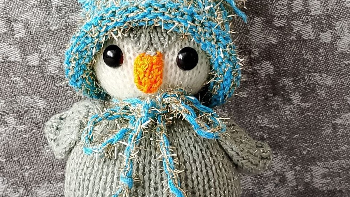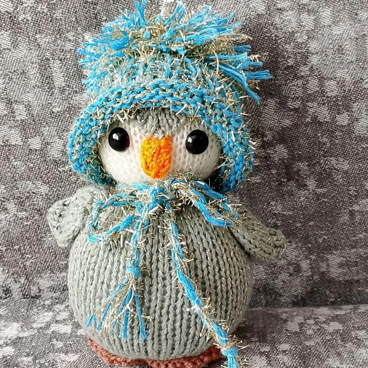 Уютный пингвинёнок в зимнем образе: мягкое серое тельце, белая «маска», яркий оранжевый клювик и нарядная шапочка со шарфиком из фактурной голубой пряжи с блеском. Образ считывается сразу — милый, праздничный, с характером. Силуэт удачный, детали аккуратно собраны, глаза посажены ровно. Местами заметна разница в натяжении полотна (особенно на туловище), из-за чего фактура выглядит чуть рыхло, но в целом игрушка выглядит опрятно и готова радовать как декор или подарок (для малышей — только под присмотром из‑за пластиковых глаз).