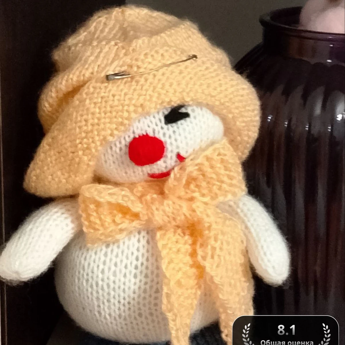 Этот очаровательный снеговик выполнен с использованием вязания спицами. Его белое тело, яркие красные акценты и нежно-желтая шапочка и шарф создают уютный и радостный образ, который подарит радость как детям, так и взрослым.