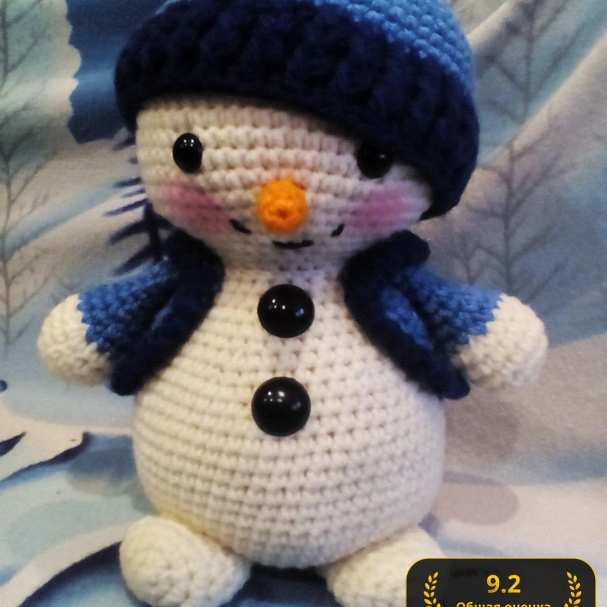 Этот очаровательный снежный человечек выполнен в технике амигуруми. Он идеально подходит, чтобы добавить зимнего настроения в ваш дом. Его мягкая, пухлая текстура делает его идеальным компаньоном для холодных зимних вечеров. Наряженный в милую синюю шапочку и жилет, он будет отличным подарком для детей и взрослых.