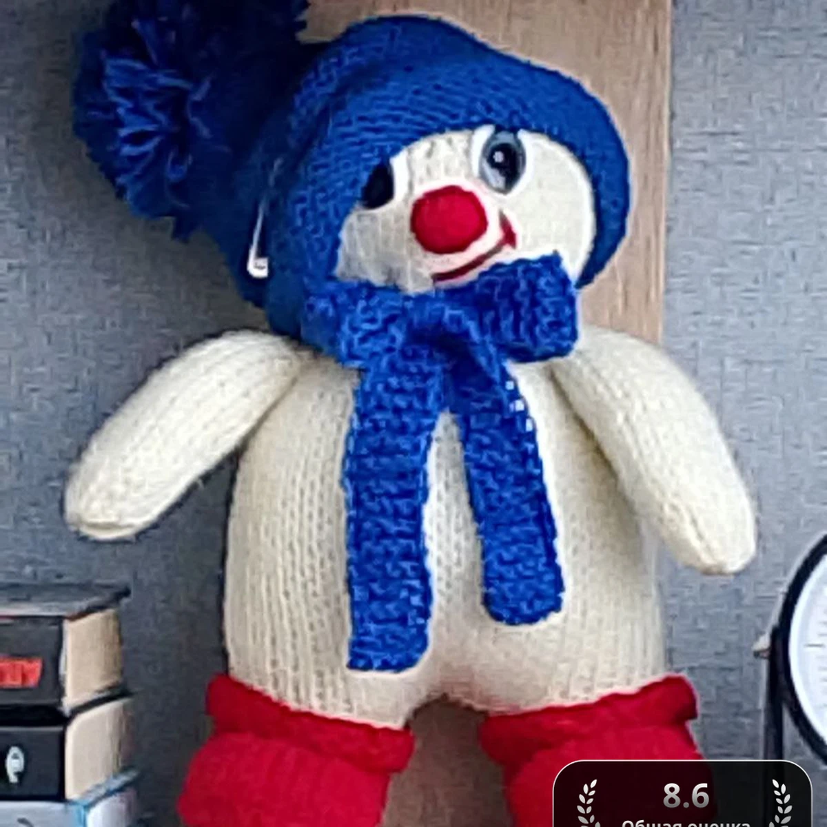 Очаровательный вязаный снеговичок сразу вызывает улыбку: пухленькое кремово-белое тельце в гладкой лицевой глади, ярко-синие шапочка с пышным помпоном и шарфик-резинка, а также сочные красные сапожки создают очень праздничное настроение. Лицо вышито аккуратно: большие вышитые глазки с белыми «бликами», мягкий красный нос-полубусинка и дружелюбная улыбка придают герою живой характер. Тело связано без швов, что делает игрушку особенно приятной на ощупь, а плотное наполнение хорошо держит форму. Игрушка уверено стоит на полочке и станет ярким зимним акцентом в интерьере или тёплым подарком ребёнку.