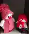 На фото представлены два очаровательных вязаных снеговичка, одетые в зимнюю одежду. Один снеговик в розовой шапке с большим помпоном и шарфе, тщательно связанный гладью. Другой - в красной шапке и с бантом. Каждый из элементов выполнен аккуратно, передавая теплую и праздничную атмосферу.