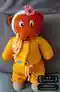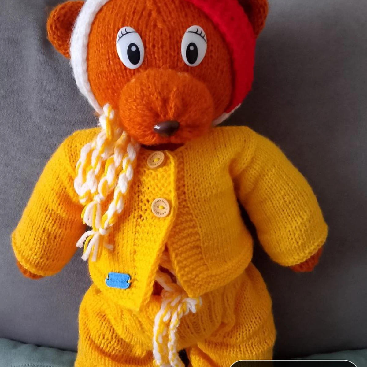 На фотографии изображен великолепно связанный плюшевый мишка ручной работы. Его яркий костюм выполнен из желтой пряжи и радует глаз насыщенной цветовой палитрой. Декоративные элементы, такие как цветок на головном уборе, придают изделию особую выразительность и индивидуальность.