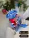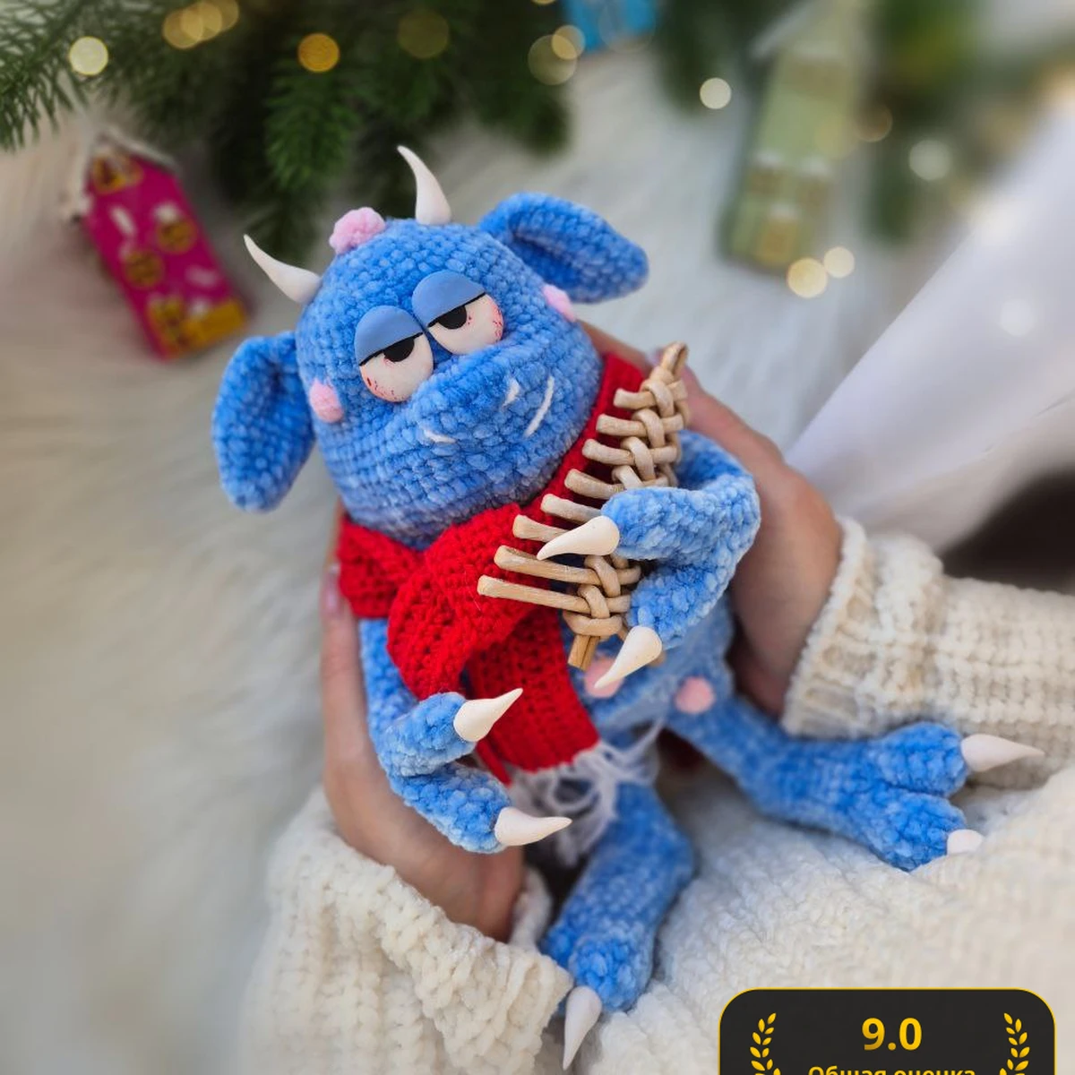 На фото — очаровательный плюшевый амигуруми-монстрик в небесно‑голубом цвете: мягкая фактура синели даёт «пушистую» поверхность и очень уютный вид. Выразительные полуприкрытые глазки с веками создают характер (соня/ворчун), а маленькие рожки и коготки добавляют игривой «монстрячести». Яркий красный шарфик связан отдельно и отлично контрастирует с голубым. В лапках — забавный аксессуар «рыбья кость», который делает сюжет и фото живыми. Снимок тёплый, с красивым боке и новогодним настроением — изделие читается сразу и выглядит подарочно.