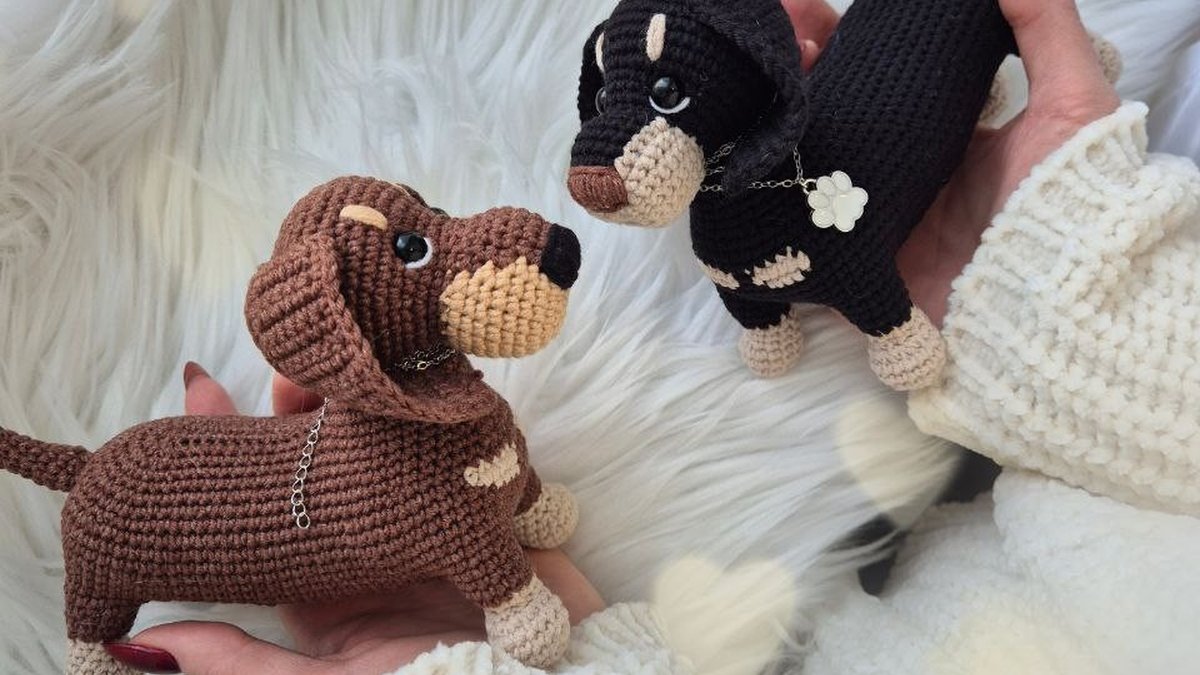 Очаровательная пара такс амигуруми — одна шоколадная, другая угольно‑чёрная, с контрастными мордочками и лапками. Полотно плотное, хорошо держит форму, силуэты узнаваемые: вытянутое туловище, аккуратные ушки, хвост «трубочкой». Глазки посажены ровно, вышивка минимальная и уместная, декоративные подвески добавляют «характер». В целом работа выглядит аккуратной и вполне товарной — видно уверенную руку и понимание пропорций.