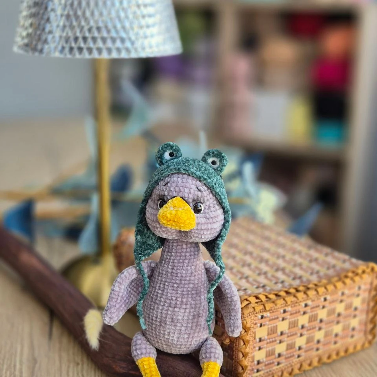 Очаровательный амигуруми-утёнок в забавной «лягушачьей» шапочке — идеальный герой для подарка и интерьерного настроения. Плюшевая фактура туловища смотрится мягко и уютно, жёлтые лапки и клюв дают сочный акцент, а шапка с глазками добавляет характер и юмор. Посадка деталей аккуратная, пропорции читаются, образ цельный и очень «живой». Фото с приятным боке и тёплой домашней атмосферой удачно подчёркивает игрушку.