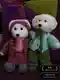 На фотографии изображены две вязаные игрушки, которые, вероятно, олицетворяют медвежат. Одна игрушка одета в розовую юбку и кофту, а другая в зеленую одежду. Обе игрушки имеют белую основу и черные пуговицы для глаз и носа, что придает им милый и дружелюбный вид. Вязаные игрушки способны украсить любую полку или стать отличным подарком для ребенка.