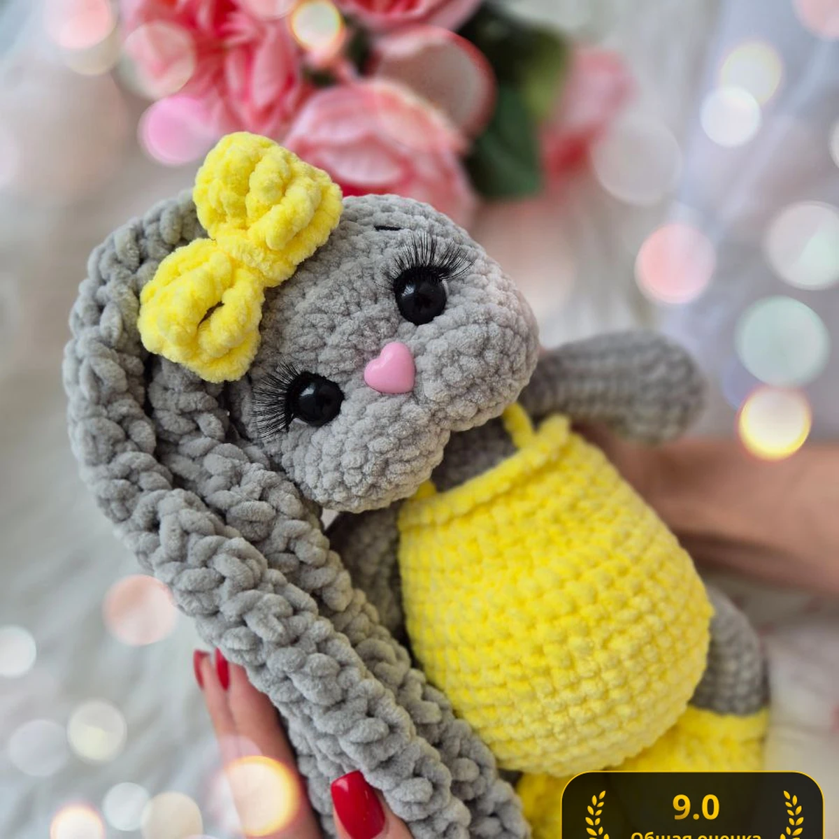 Это изделие выполнено в технике амигуруми, которая предполагает использование крючка и плотной вязки для создания маленьких игрушек. Такие игрушки часто имеют круглые и объемные детали, что делает их особенно милыми и привлекательными. Для данной игрушки были использованы основные техники вязаного полотна, с акцентом на соединение круговых деталей. Конструкция начинается с вязания головы и ушей. Это требует аккуратной работы с убавками и прибавками петель, чтобы создать нужную форму. После вязания головы и ушей, их обрабатывают, добавляя элементы вышивки или дополнительные украшения. В данном случае используется розовое сердечко для носика, что придает дополнительную изюминку. Для создания платья и банта используется та же техника, что и для основной конструкции, но с изменением плотности вязания и тонкости пряжи, чтобы создать визуальный контраст. Желтые элементы прекрасно контрастируют с серым явно выделяя игрушку и делая ее веселее. Конструкция завершается добавлением мелких деталей, таких как глаза (возможно, с использованием безопасных пластиковых глаз) и других finishing touches, которые придают изделию законченный вид.
