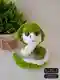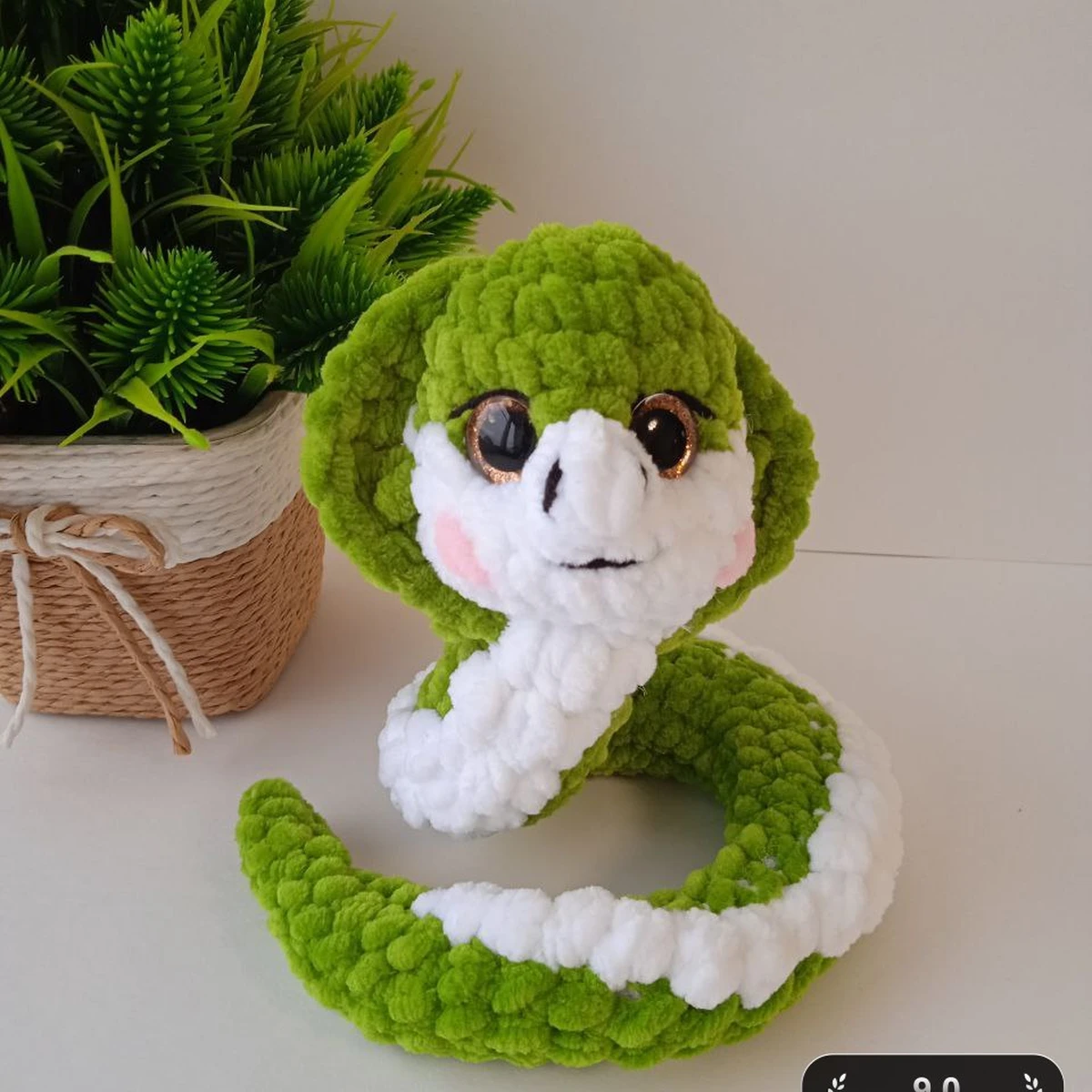 На фотографии изображена очаровательная вязаная игрушка в виде змеи. Она выполнена из плюшевой пряжи, что придаёт ей мягкость и текстуру, приятную на ощупь. Зеленый и белый цвета отлично сочетаются, придавая игрушке реалистичный и одновременно милый вид. Присутствие растений в композиции добавляет снимку естественность и гармонию.