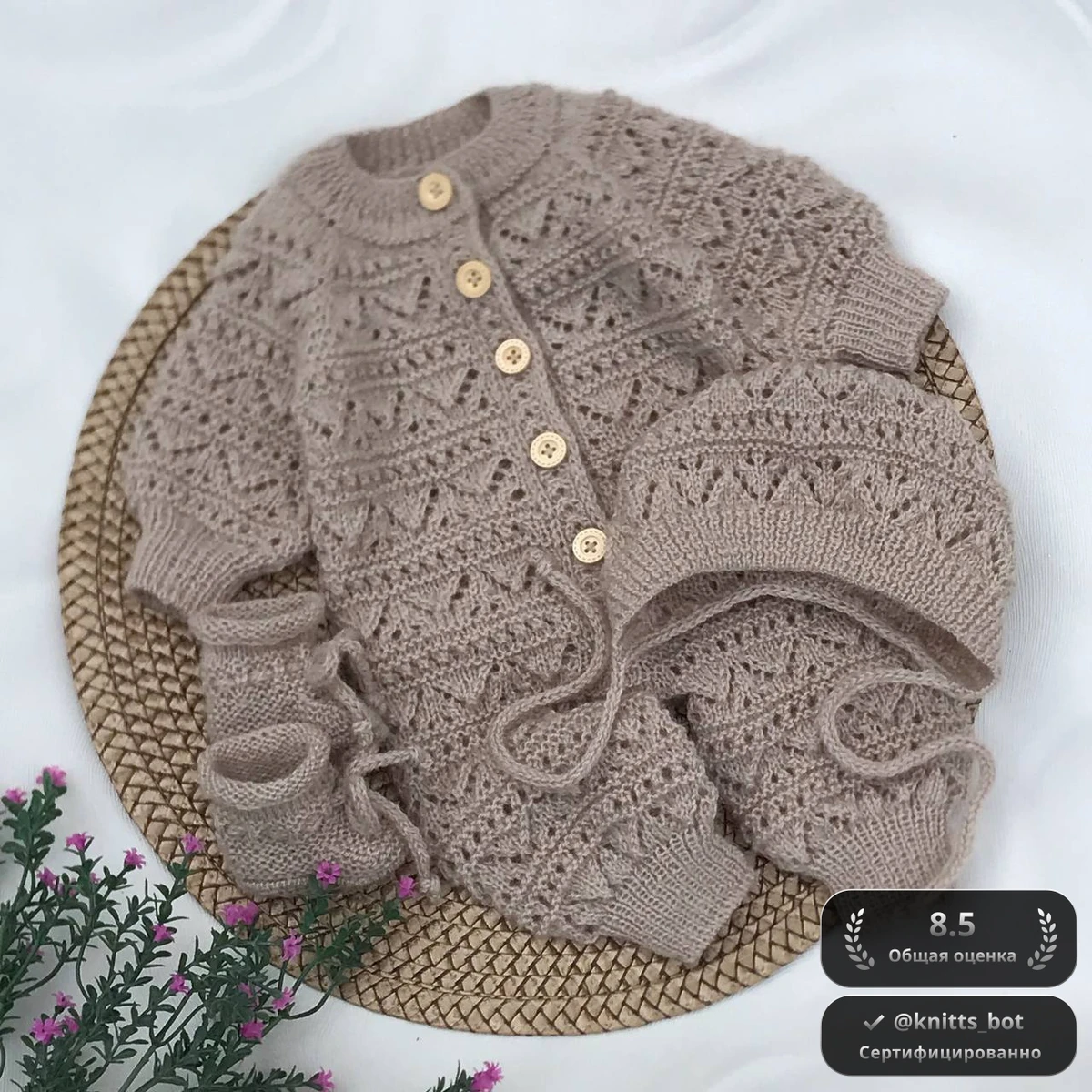 Комплект выполнен с использованием ручного вязания спицами. Основной узор — ажурный узор с ромбами, создающий эффект легкости и воздушности. Комбинезон выполнен с использованием классической лицевой и изнаночной вязки, манжеты связаны резинкой (1x1), что добавляет эластичности и комфорта. Шапочка выполнена с подобным узором, что создает гармоничный и стильный ансамбль. Пуговицы пришиты вручную, что подчеркивает внимание к деталям.