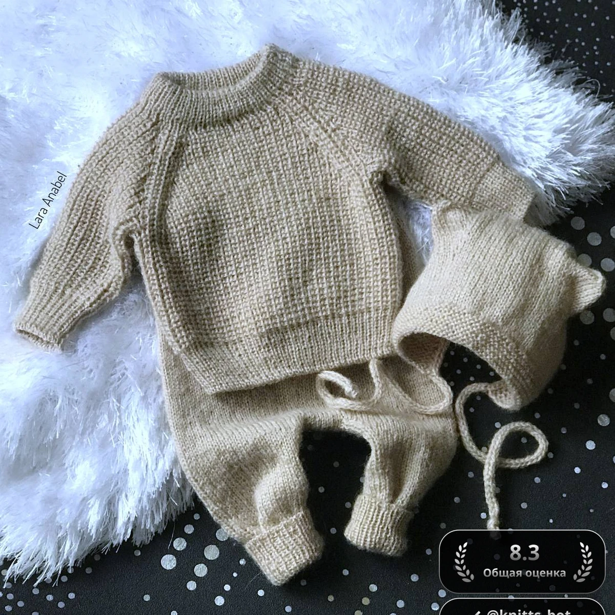 Для создания этого чудесного комплекта использовался регланный метод вязания, который позволяет аккуратно создать плавные плечевые и рукавные линии. Благодаря реглану изделие сидит комфортно и ровно. Основной узор представлен плотной лицевой гладью, обеспечивая изделию более строгую текстуру и формоустойчивость. По краям использован резинка 1x1, которая не только придаёт изделию завершённый вид, но и помогает удерживать форму. Швы выполнены с применением невидимого метода закрытия, что дарит изделию аккуратность и комфорт в носке. Шапочка связана также по кругу с легкими ушками, добавляющими игривость и очарование модели. Этот элемент может потребовать отдельного внимания и аккуратности в работе с убавлениями. Общий стиль комплекта — минималистичный, но за счёт текстуры и формы он выглядит стильно и современно.