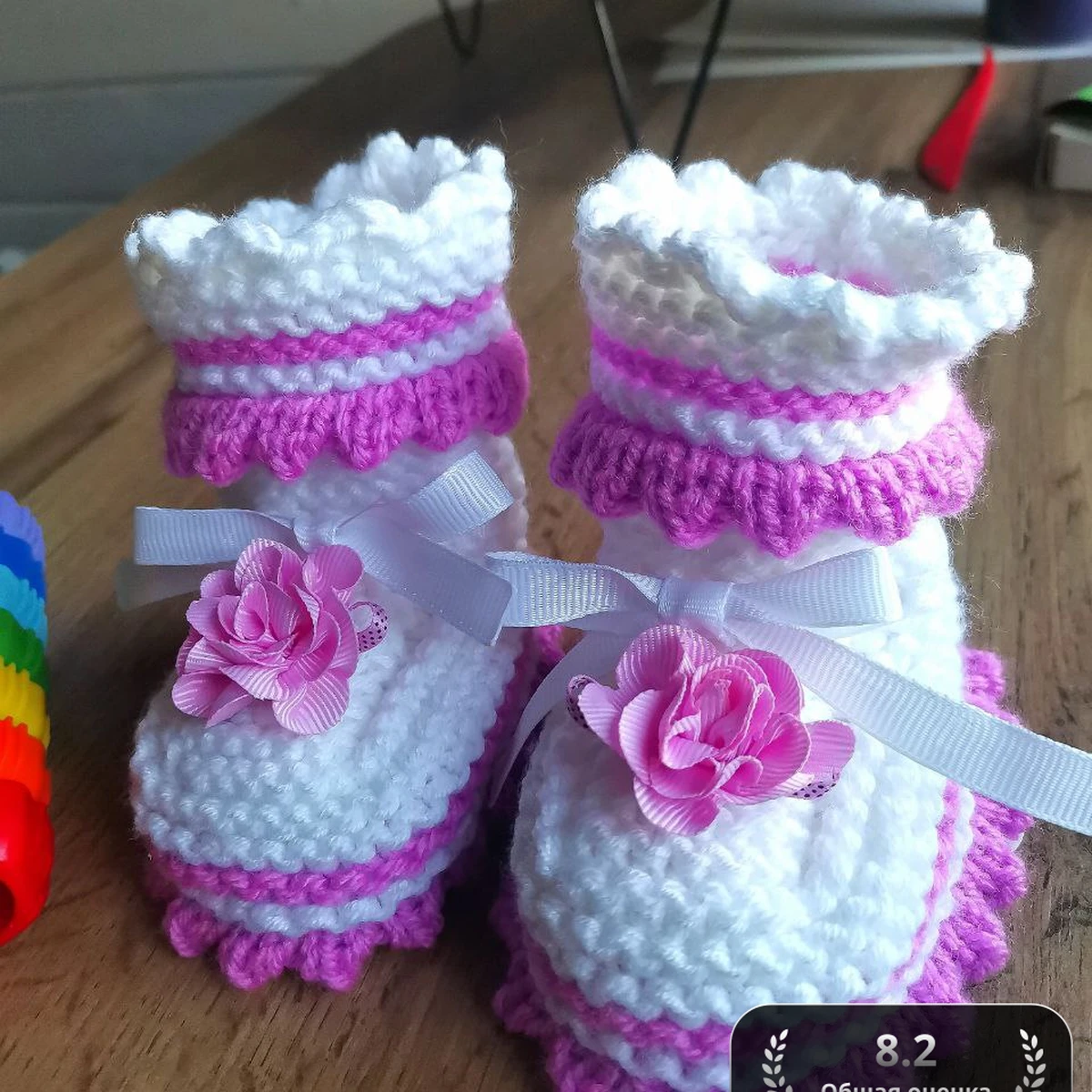 Это изделие выполнено крючком, сочетающим базовые техники вязания в круге и по спирали. Основу составляет простая вязка столбиками без накида, что придаёт изделию плотность и мягкость. Оформление верхней части сапожек создаётся путем чередования кружевных рядов как из вытянутых петель, так и из простых столбиков с накидом, создавая эффект изысканной драпировки. Для оформления обуви были использованы декоративные элементы, такие как вязаные цветы и нежные бантики из атласной ленточки, которые пришиваются с использованием швейных игл для декоративной аккуратности. Завершающим штрихом является использование пряжи разных цветов для создания яркого и запоминающегося дизайна, подчеркивающего детскую невинность и яркость.