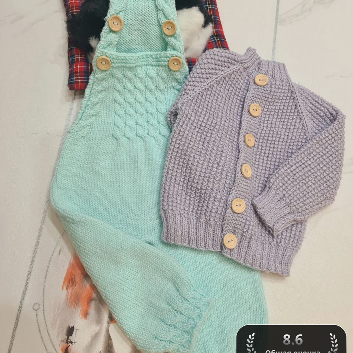 На изображении представлены очаровательные детские вязаные изделия: светло-голубой комбинезон с красивыми узорами и милый лавандовый пуловер с крупными деревянными пуговицами. Детали и текстура изделий создают уютное и стильное впечатление. Мягкость цвета и декоративные элементы делают их идеальными для детей, создавая тепло и комфорт.