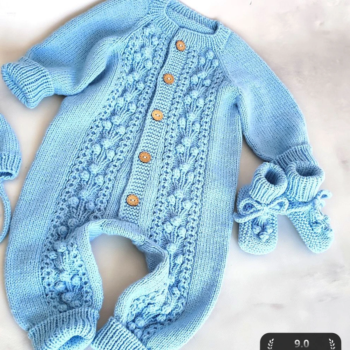 На фотографии мы видим очаровательный вязаный комбинезон с ботиночками для малыша. Комбинезон выполнен в нежно-голубом цвете, который отлично подойдет для мальчика или девочки. Центральная часть украшена сложным узором с косами и ажурными вставками, что придаёт изделию уникальность. Деревянные пуговицы добавляют естественного и уютного акцента, а ботиночки завершают милый комплект, сохраняя ножки ребёнка в тепле.