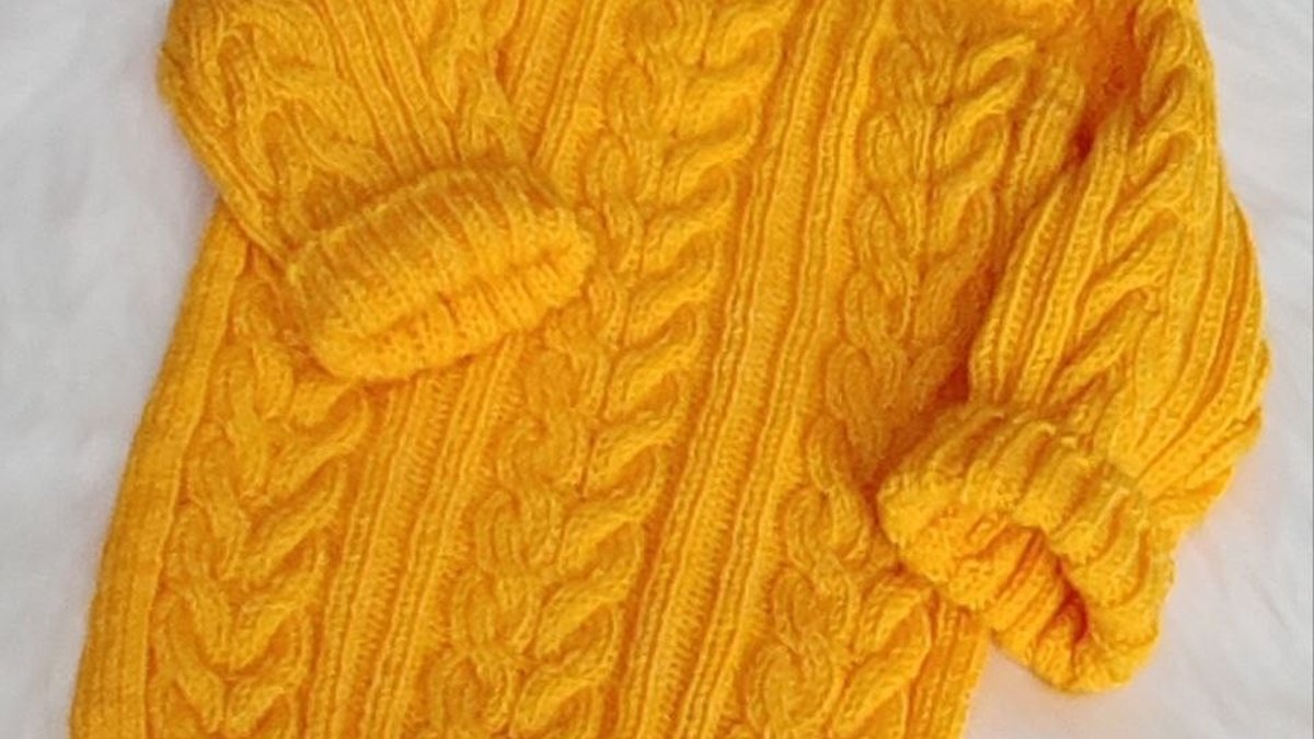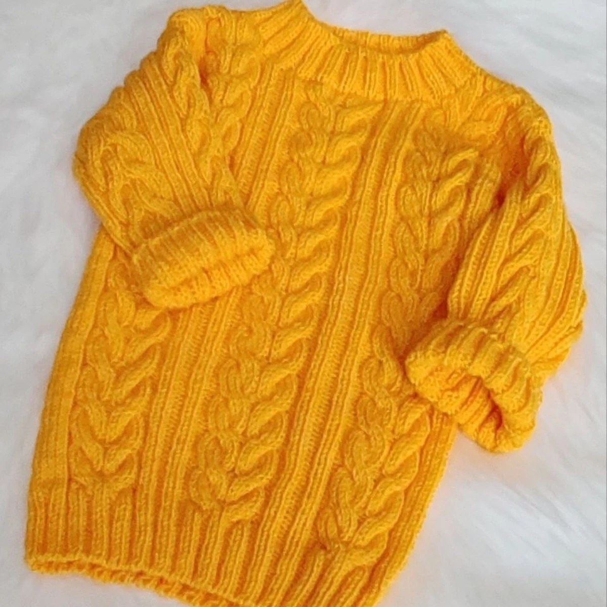 Солнечный горчичный свитер с выразительными косами и вертикальными дорожками резинки выглядит по-настоящему уютно и «дорого». Рельефные жгуты связаны ровно, рисунок читается, манжеты и низ аккуратно оформлены резинкой, рукава смотрятся мягко присобранными. Модель классическая, зато очень носибельная: такой фактурой легко «вытянуть» даже однотонную вещь и сделать её акцентом гардероба.