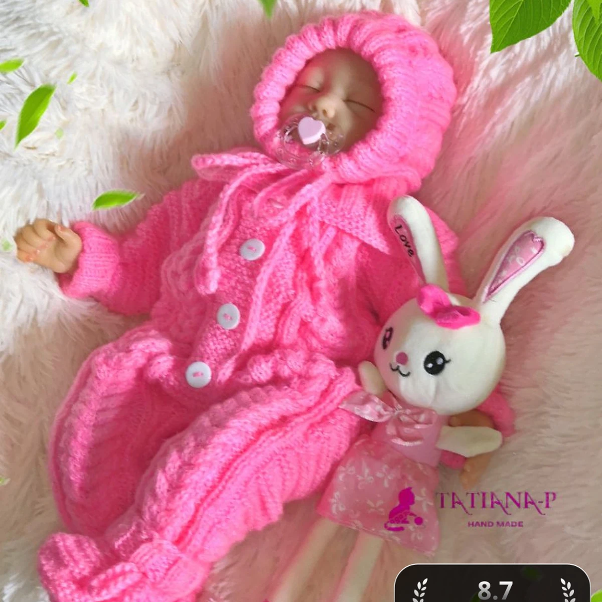 Очаровательный розовый вязаный комбинезон с капюшоном на крошечном «малыше» сразу вызывает умиление. Объёмные косы вдоль ножек и ручек создают красивую фактуру, резинка 2×2 придаёт эластичность, а аккуратная планка с белыми пуговками добавляет нежного контраста. Капюшон с ровной кулиской плотно облегает личико, а мягкие манжеты закрывают ручки и ножки, сохраняя тепло. В комплекте уютный плюшевый зайка, подчёркивающий детскую тематику. Работа выглядит тёплой, ухоженной и тщательно выполненной, идеально подходящей для фотосессий новорождённых или уютных прогулок.
