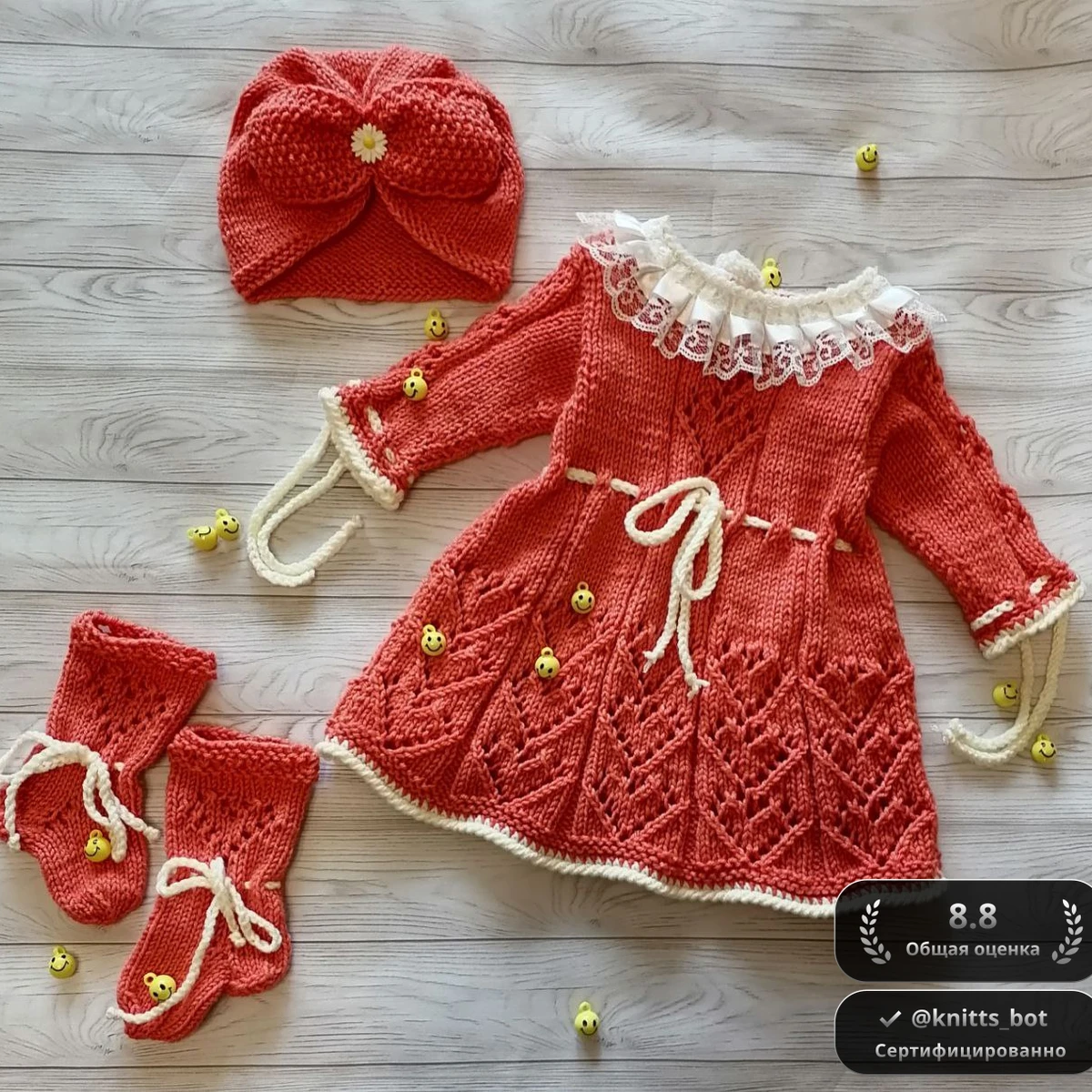Очаровательный малышковый комплект из коралловой мериносовой пряжи: ажурное платьице с лифом лицевой гладью и роскошным клиновидным узором «листья» по подолу, дополненное контрастной молочной обвязкой «рачий шаг» и тонким I-cord шнурком на талии и манжетах. Украшение – воздушный кружевной воротничок и весёлые смайлик-пуговки. Тюрбан-чепчик связан узором «рис» и собран в эффектный бантик, подчеркнутый малюсенькой ромашкой. Носочки-следочки повторяют ажур платья и фиксируются шнурками. Комплект смотрится нежно, нарядно и очень современно, идеально подойдёт для фотосессии или торжества.