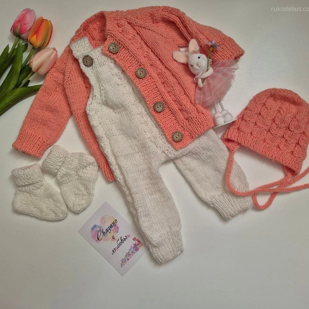 Нежный комплект для малыша в кораллово-сливочной гамме выглядит очень цельно и «магазинно»: кардиган с аккуратными косами и планкой на пуговицах, штанишки с мягкими манжетами, шапочка с рельефным узором и пинетки в тон. Полотно в целом ровное, убавки/прибавки визуально чистые, резинки держат форму. Палитра удачная — тёплый коралл красиво подчёркивает молочный оттенок. Есть ощущение продуманного набора «на выписку/подарок», а декоративные детали делают работу особенно уютной.