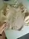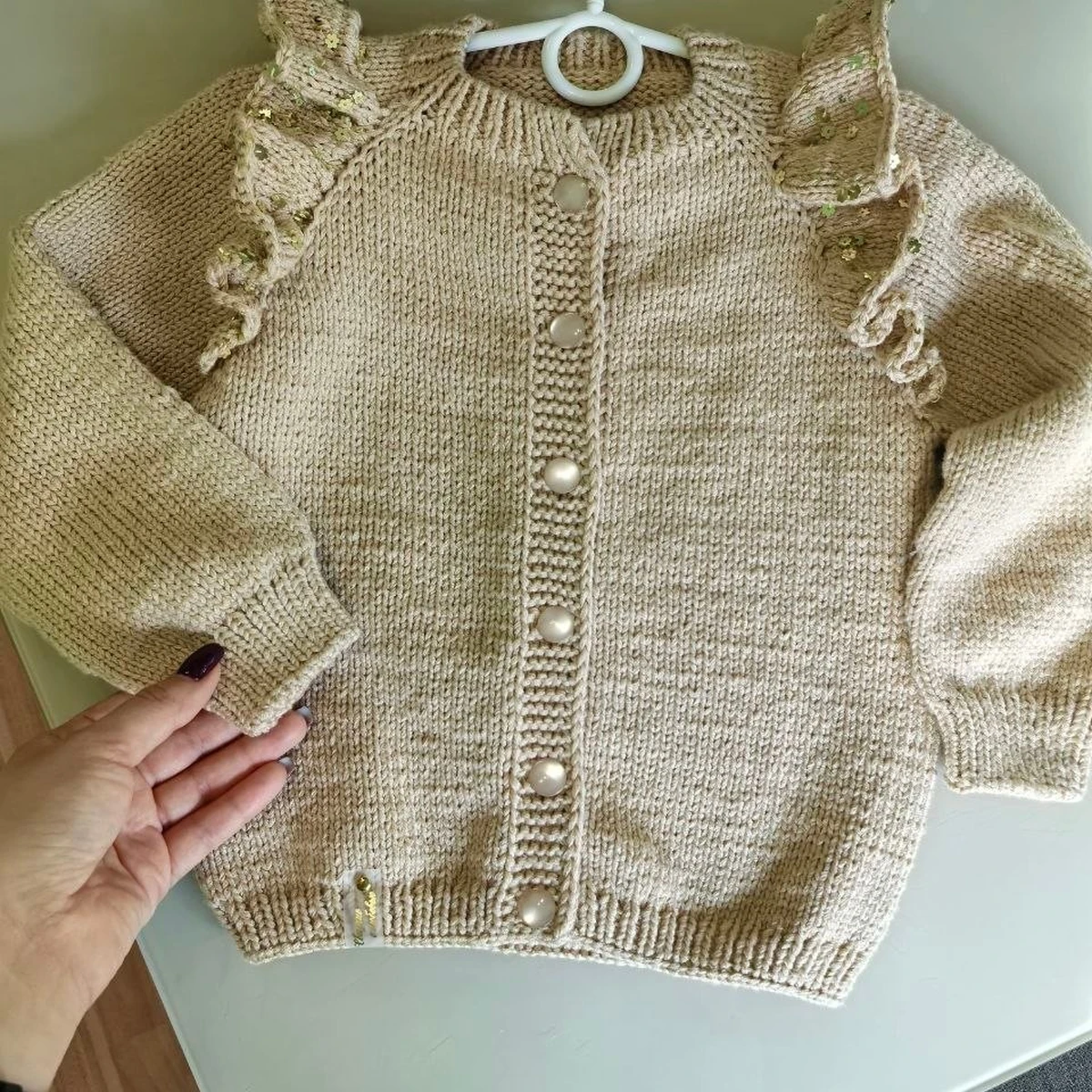 Нежный детский кардиган в тёплом бежевом оттенке смотрится аккуратно и «дорого» за счёт лаконичного силуэта и выразительных воланов по линии реглана. Основное полотно связано ровной лицевой гладью, планка — платочной вязкой, застёжка на крупные пуговицы добавляет уютной ретро-нотки. Манжеты и низ выполнены резинкой, посадка выглядит комфортной и практичной для ребёнка. В целом работа крепкая, с хорошей базовой техникой и приятным, носибельным характером.