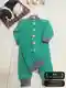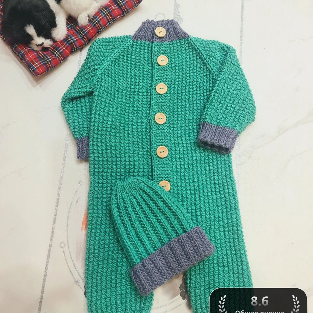 На фотографии представлено очаровательное вязаное детское комбинезон с шапочкой. Использована замечательная комбинация ярко-зеленого и темно-серого цветов, что придаёт изделию превосходное цветовое сочетание. Большие, деревянные пуговицы добавляют уют и функциональность. Дизайн идеально подходит для малышей и выглядит одновременно комфортно и модно. Рядом с комплектом расположен мягкий щенок, что усиливает атмосферу тепла и уюта.