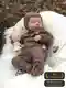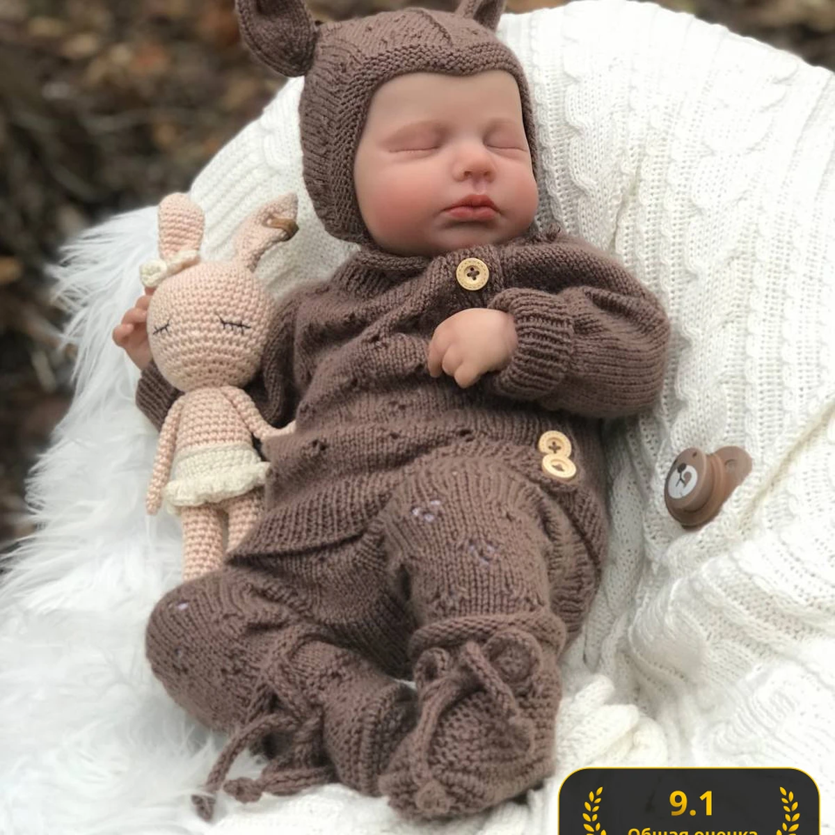Очаровательный комплект для новорождённого — цельновязаный коричневый комбинезон со шнуровкой на манжетах, шапочка-капор с острыми ушками, мягкие пинетки-мачты и нежная амигуруми-зайка в тон. Строгий однотон подчёркивает аккуратную лицевую гладь, рельефные стрелки и мелкие «пупырышки» на ножках. Небольшие деревянные пуговицы-пятачки добавляют тепла и рустикального шарма, а кремовый плед-фон делает фактуру петель хорошо читаемой. Образ получается уютным, лесным и невероятно фотогеничным.