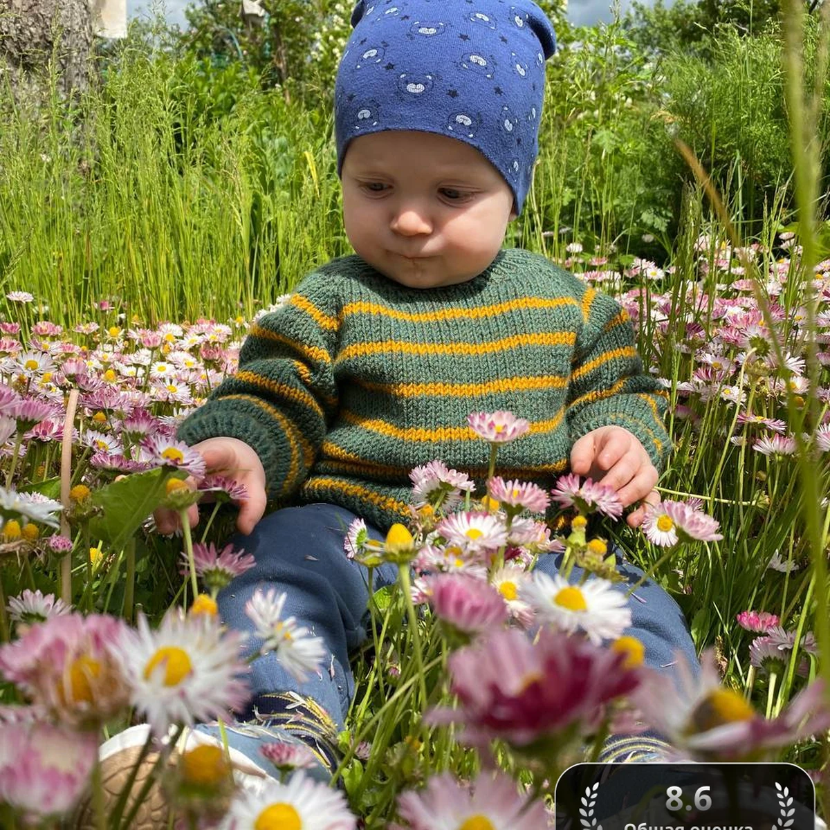 Очаровательный детский свитер связан гладью ярко-лесного изумрудно-зелёного цвета с золотисто-горчичными полосками, создающими живую «лесную» ритмику. Мягкая ровная лицевая гладь подчёркивает чистые линии, а аккуратные плотные резинки по вороту, манжетам и нижнему краю делают изделие уютным и прекрасно сидящим на малыше. Полосы равномерно распределены по туловищу и рукавам, что даёт гармоничное визуальное единство. Мелкий ровный шаг петель и отсутствие перекосов показывают внимательность к деталям. В сочетании с цветущим фоном этот свитер выглядит как весенняя сказка!