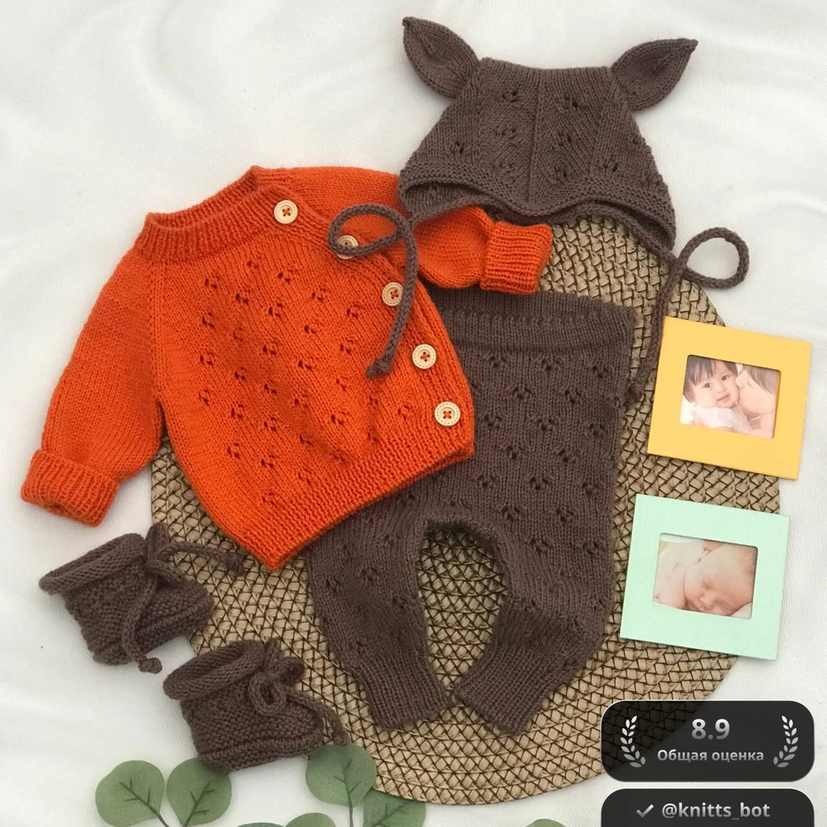 Очаровательный детский комплект из четырёх предметов: яркий тыквенно-оранжевый реглан на пуговицах, шоколадные штанишки с ластовицей, шапочка с ушками и мягкие пинетки-чешки. Все детали объединяет аккуратный ажурный рисунок «дырок» в шахматном порядке, который добавляет лёгкости полотну и визуально связывает разноцветные элементы в единый образ. Плавные регланные линии, ровные убавки на манжетах и идеально пришитые деревянные пуговки подчёркивают высокий уровень исполнения. Контраст тёплого оранжа и землистого коричневого выглядит по-осеннему уютно и стильно, а нежная пряжа средней толщины делает комплект практичным и комфортным для малыша.