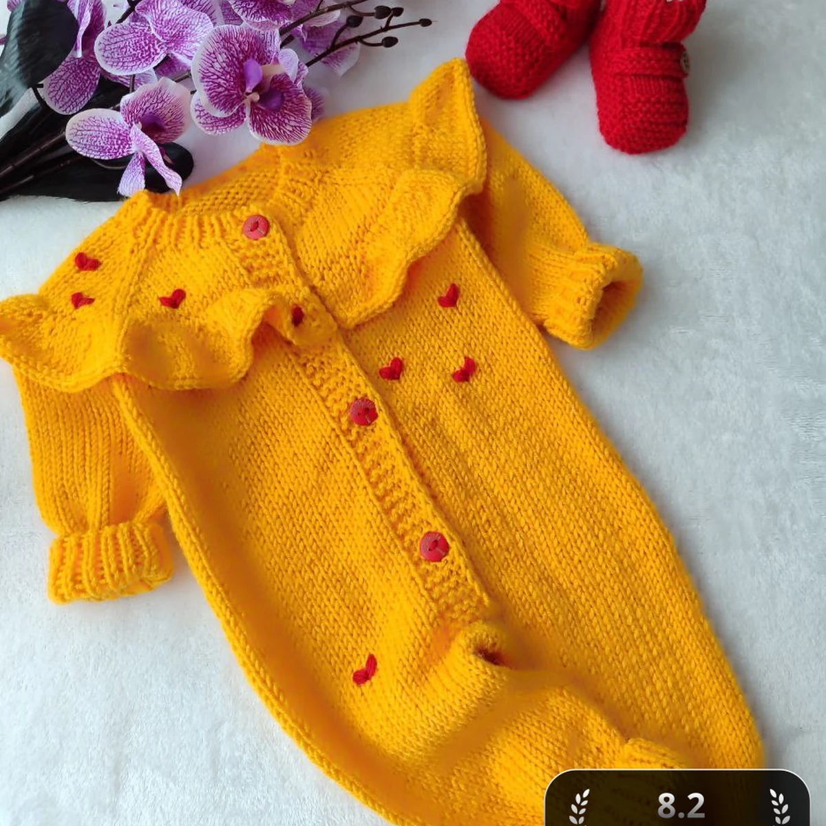 Этот милый детский комбинезон выполнен в ярком жёлтом цвете и украшен красными пуговицами и декоративными маленькими сердечками. Рябрик выполнен с изящной оборкой. В комплекте идут уютные красные пинетки, создавая гармоничное сочетание. Такая одежда будет сохранять тепло малыша и радовать глаз родителей!