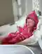 - Пряжа средней толщины (примерно 250–350 м/100 г), мягкая детская: меринос/полумеринос или акрил детский; основной цвет малиновый — ~140–180 г.