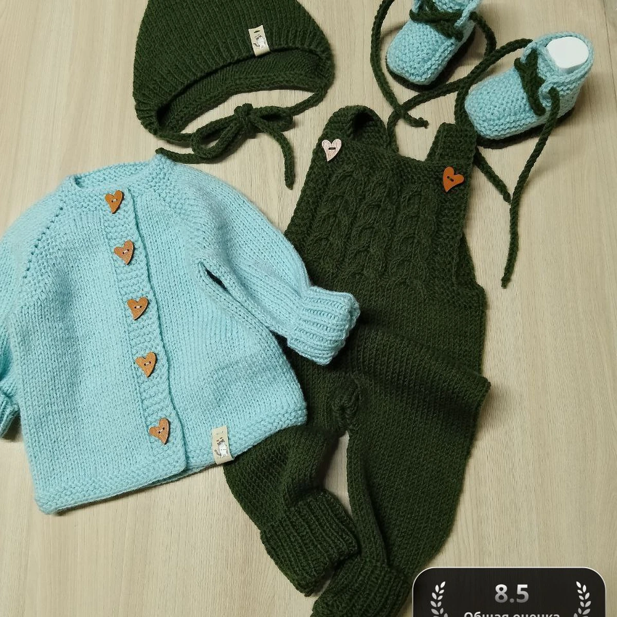 На фото представлено очаровательное детское вязаное комплект, который включает в себя зеленую шапочку, голубую кофточку с пуговками в форме сердечек, милый зеленый комбинезон и парочку голубых пинеток с зелеными акцентами. Эти вещи прекрасно дополняют друг друга, создавая гармоничный ансамбль, который будет не только красивым, но и удобным для малыша.