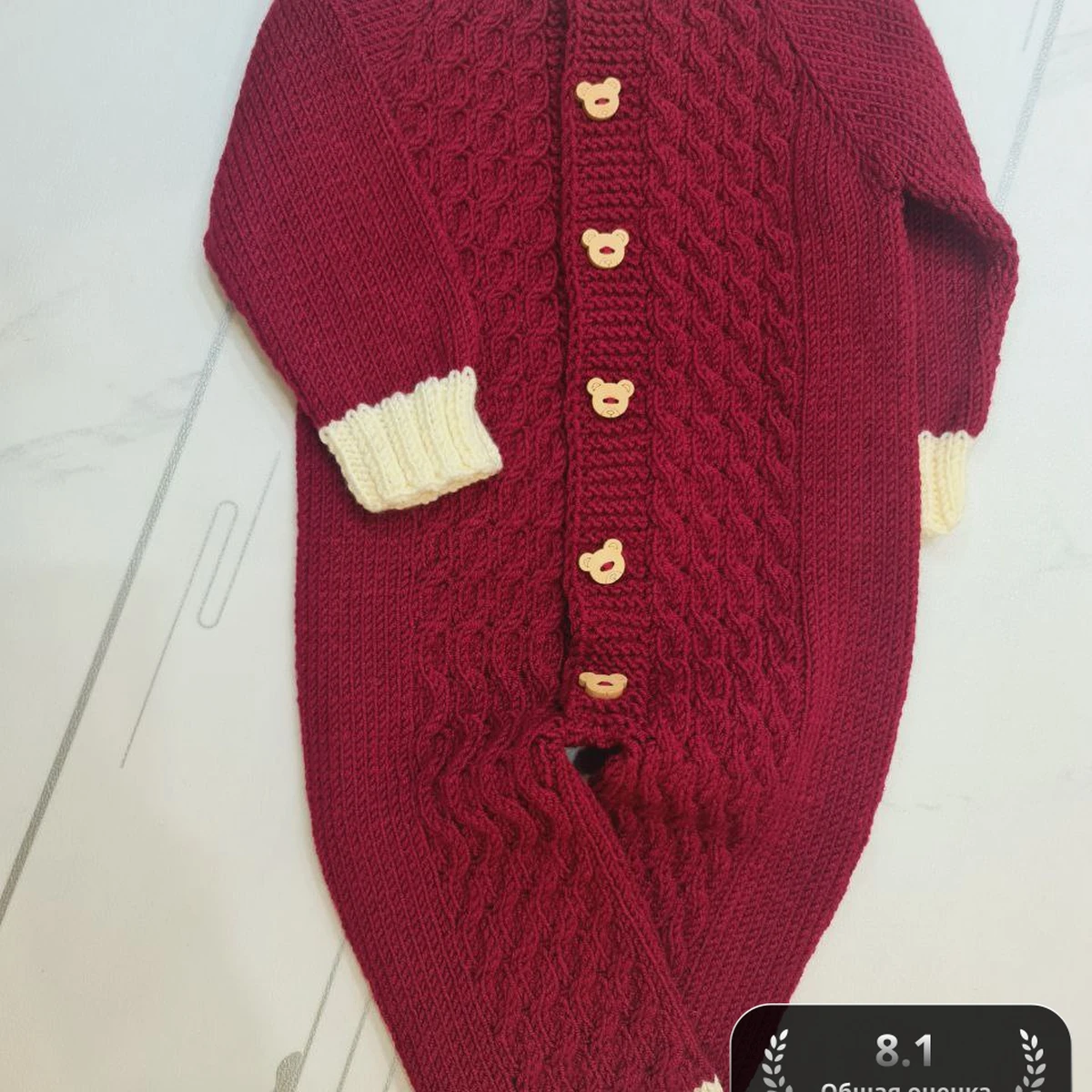 Этот очаровательный комбинезон выполнен в насыщенном бордовом цвете с контрастными белыми манжетами и воротником. Петельный узор на передней части изделия придаёт текстуру и стиль. Центральная застёжка на милых деревянных пуговицах, напоминающих мордочки медвежат, добавляет игривую деталь, удобную для малышей.