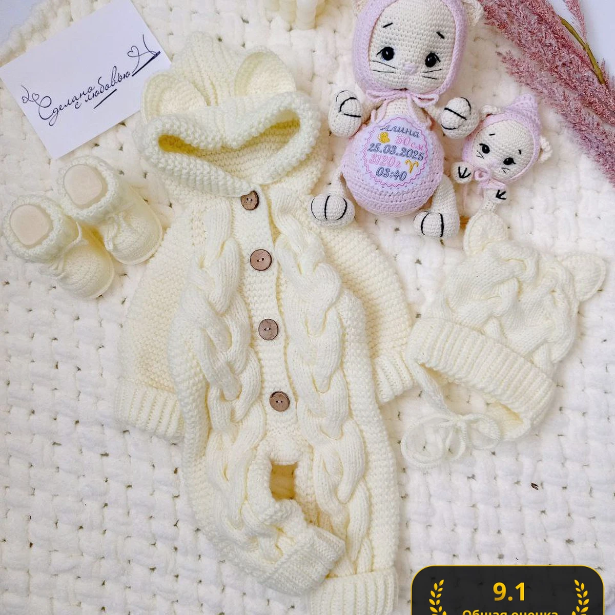 На фото представлены очаровательные вязаные вещи, идеально подходящие для новорождённых. Комплект состоит из милого комбинезончика с капюшоном, который украшен изящными косами, тёплых пинеток и шапочки. Вязаные игрушки в виде мишек добавляют комплекту особого обаяния и делают его особенно привлекательным для подарка. Цветовая палитра изделия — нежный кремовый цвет, создающий ощущение тепла и уюта.