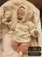 На фото изображен очаровательный детский вязаный комплект: кремовая кофточка с капюшоном и ушками, а также розовые вязаные штанишки. Этот набор прекрасно подходит для малышей и обеспечивает им тепло и комфорт. Кофточка выполнена в текстуре, создающей объем и мягкость, в то время как детали, такие как капюшон с ушками, придают изделию особый шарм.