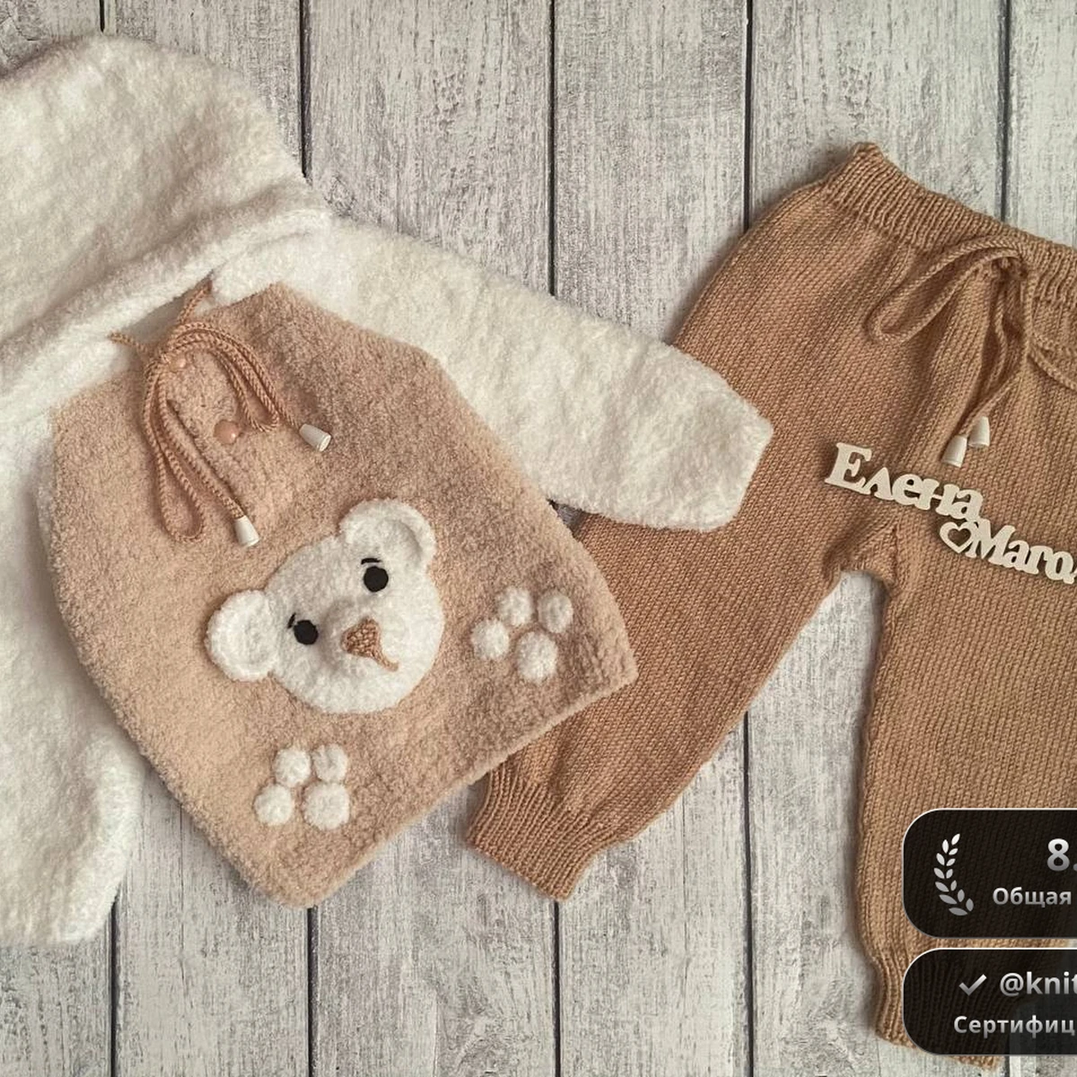 Худи выполнена снизу вверх классическими круговыми спицами №4,5, используя комбинированный приём: основная часть – нить велсофт с коротким ворсом, связанная лицевой гладью, что позволяет добиться ровного полотна и подчёркнутой мягкости. Рукава вывязаны по кругу методом «magic loop» без швов, после чего по открытым петлям добран капюшон; его вершина закрыта тройным «шовным» способом с соединением «петля в петлю», чтобы избежать грубых ступенек. Вдоль горловины выполнена кулиска, сформированная двойной кромочной и подгибом, в которую продёрнут скрученный айкорд-шнур. Аппликация медвежонка связана крючком №3 из микроплюшевой пряжи по кругу столбиками без накида; ушки и лапки пришиты потайным матрасным швом, а носик вышит шёлковым шнуром тамбурным стежком. Глазки надёжно закреплены окантовкой из французских узелков. Брюки связаны по кругу снизу вверх лицевой гладью спицами №3,5. Манжеты и пояс выполнены резинкой 1×1 с итальянским набором и эластичным закрытием иглой. Для сидения применены укороченные ряды «German short rows», обеспечивающие лучшую посадку по памперсу. Все хвостики прятались вертикальным дублерующим швом, чтобы не было утолщений даже на тонком полотне.